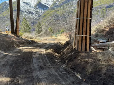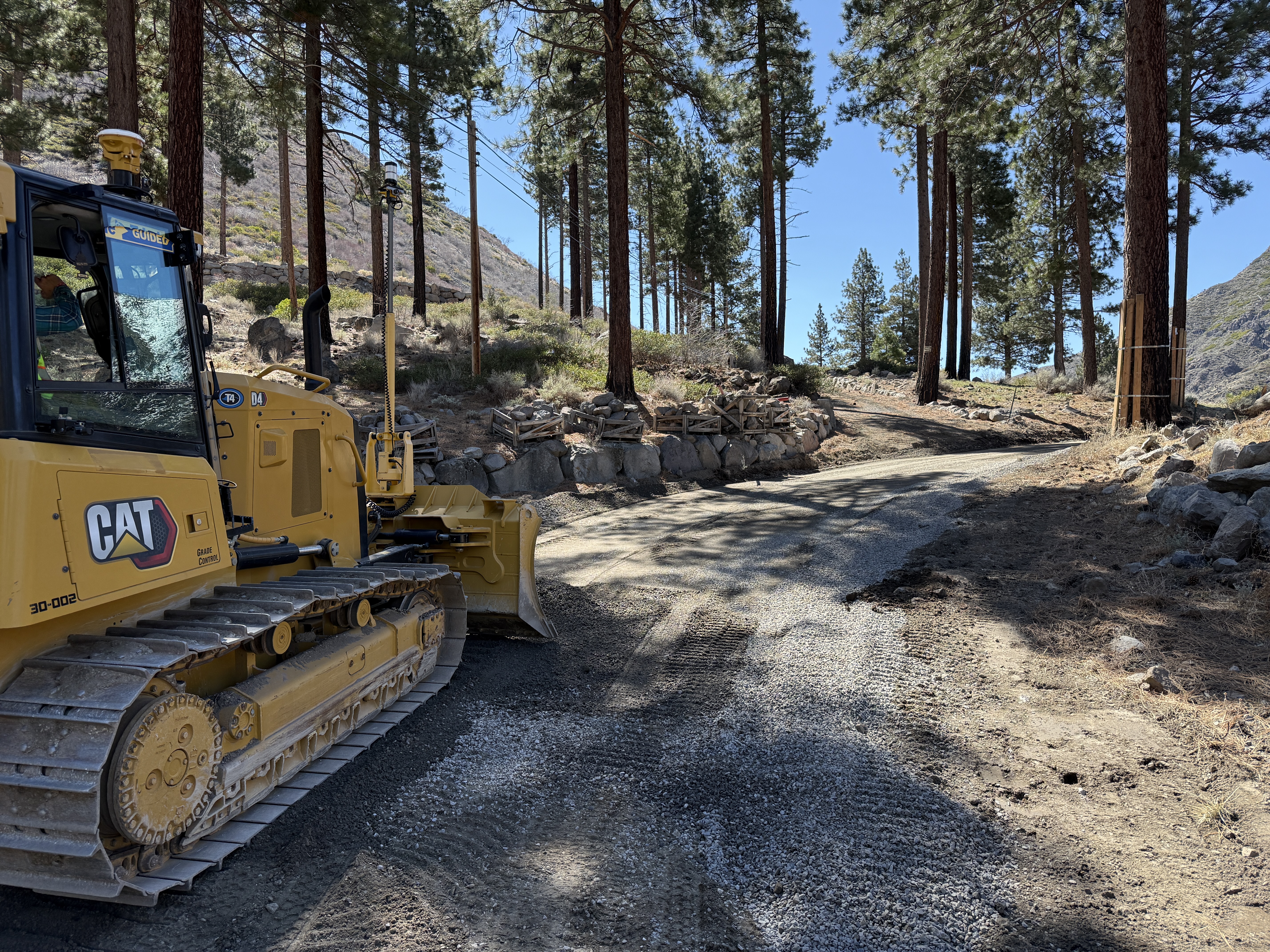 The image shows a bulldozer positioned on a graded unpaved road amidst a forested area. The equipment appears to be used for site grading or road preparation. There are no visible markings or barriers indicating specific project phases. The area is clear with minimal vegetation hindrance.