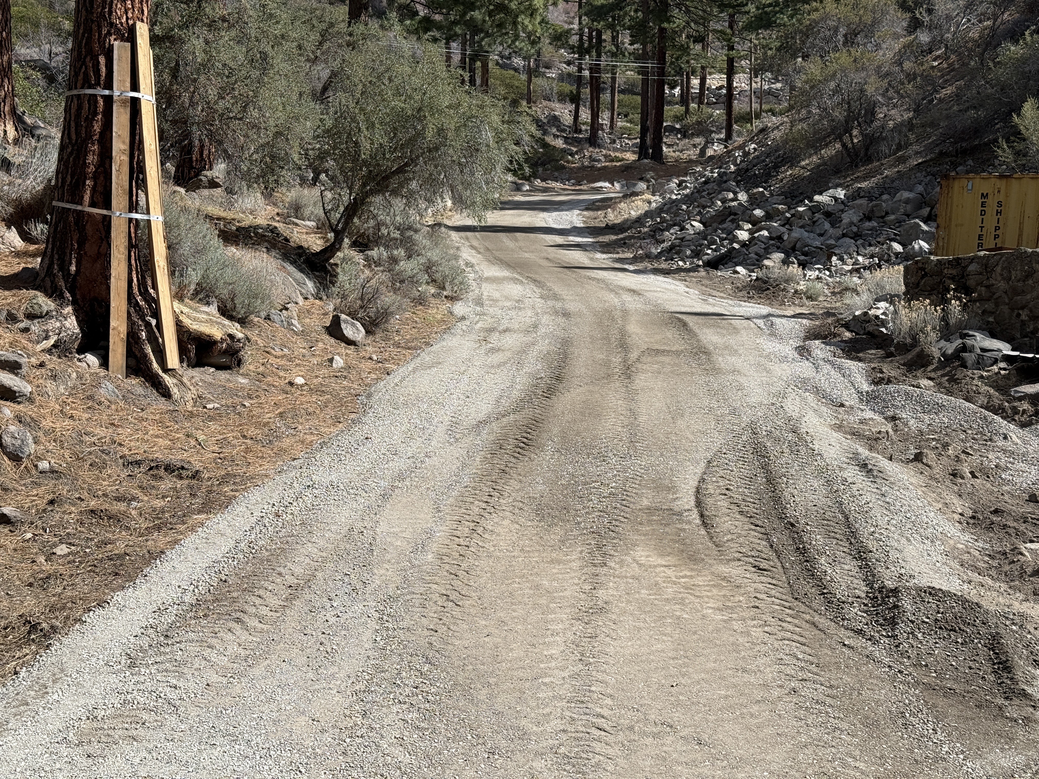 The image shows a dirt access road with tire tracks running through it, indicating recent use by vehicles. There are trees along the left side of the road with wooden supports attached to one. A shipping container is visible on the right side, positioned near a rocky slope. No active construction work or equipment is visible.