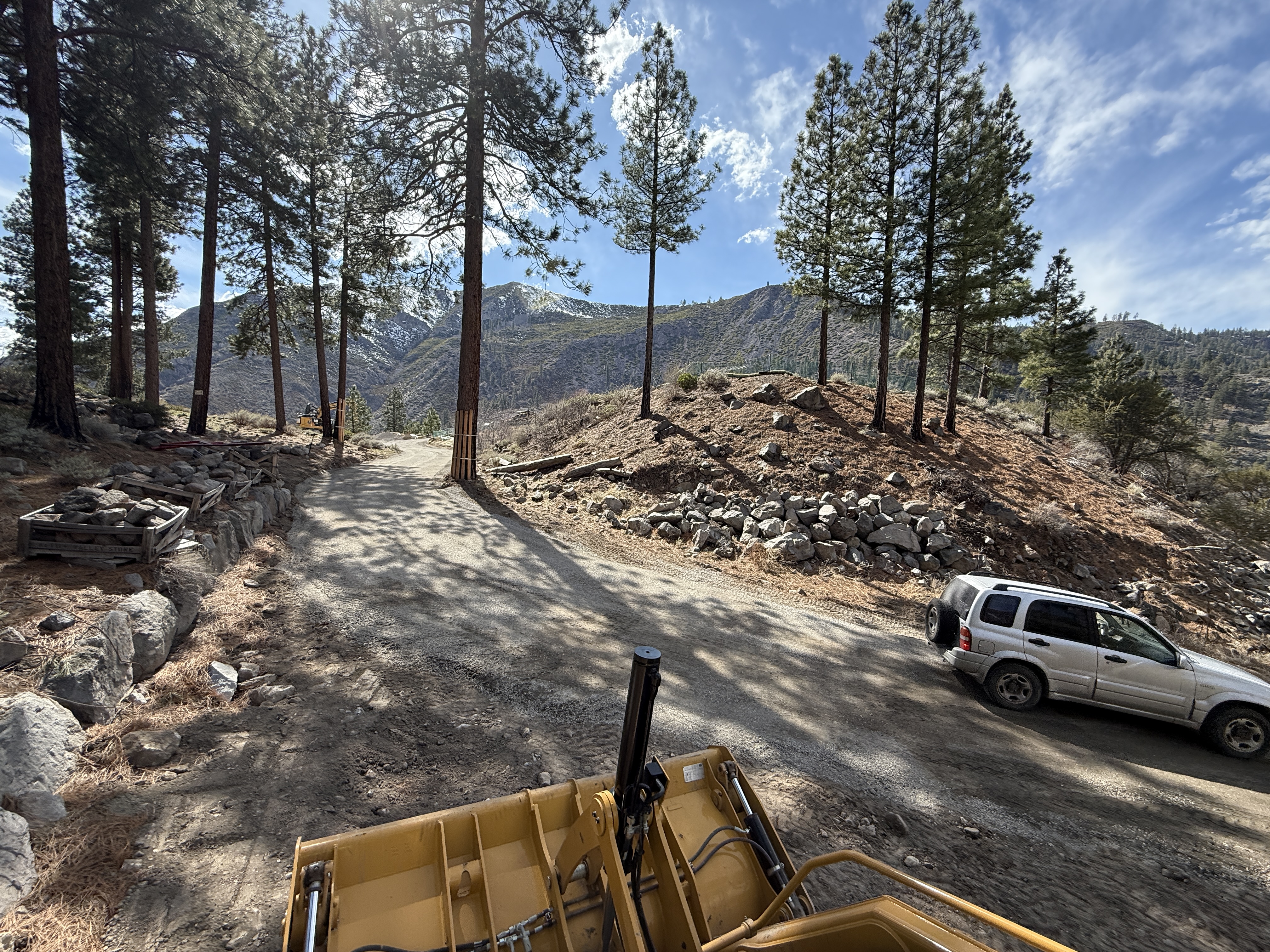 The image shows a dirt access road with a front loader in the foreground and a white SUV on the right side. The road is lined with large rocks and surrounded by conifer trees and mountainous terrain. Sunlight is filtering through the trees. There are wooden crates with rocks on the side of the road. This appears to be a scenic, forested area with ongoing road work.