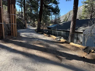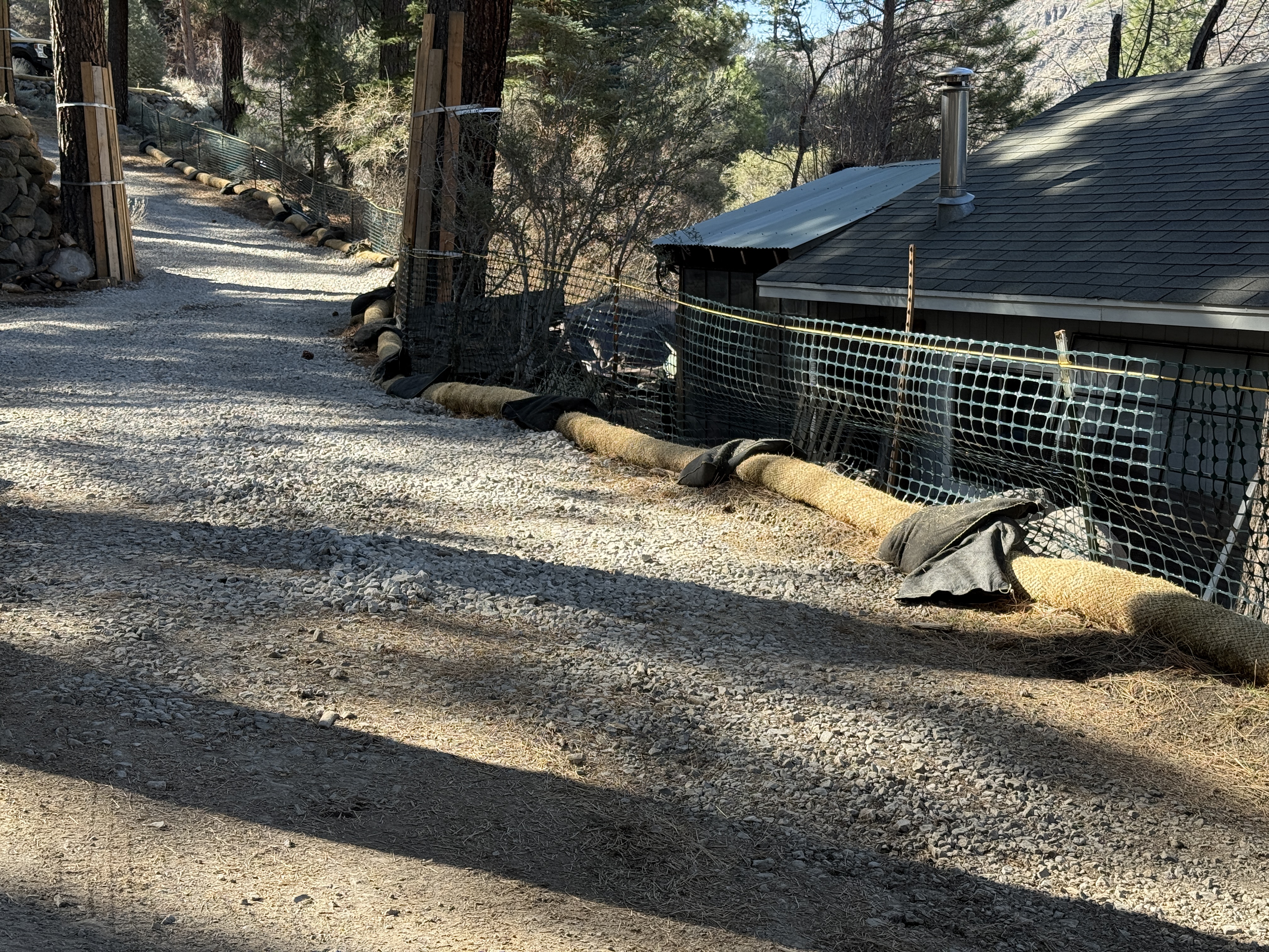 The gravel access road is framed by erosion control measures such as wattles positioned along its edges. Temporary fencing is visible on the right side adjacent to a structure with a metal chimney. The setting appears to be in a forested area with sunlight creating shadows across the scene.