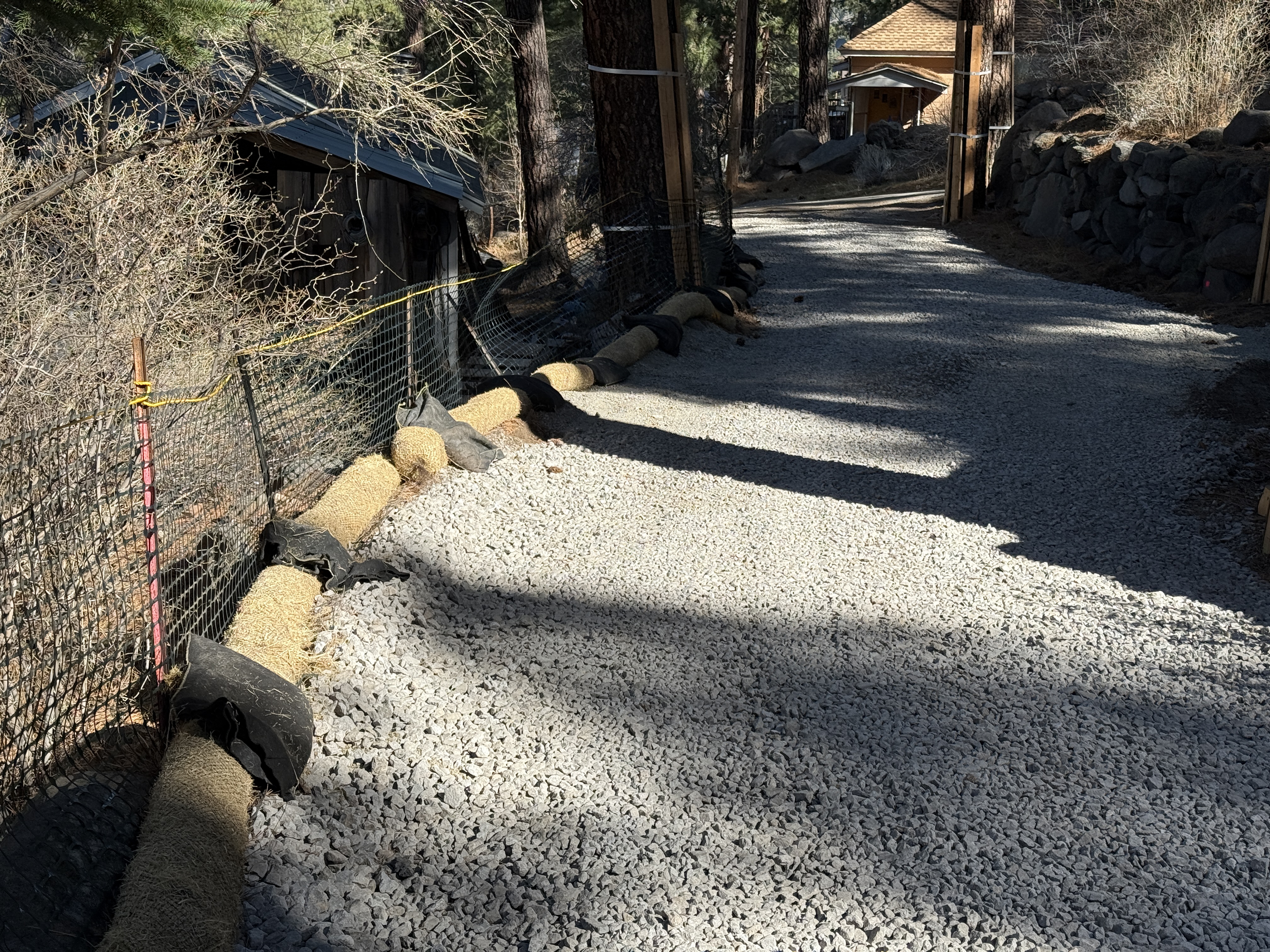 The image shows an access road with erosion control measures in place. Fiber rolls are placed along one side of the road, adjacent to a temporary construction fence. The road surface consists of compacted gravel. A building is visible at the end of the road. Shadows suggest sunny weather conditions.
