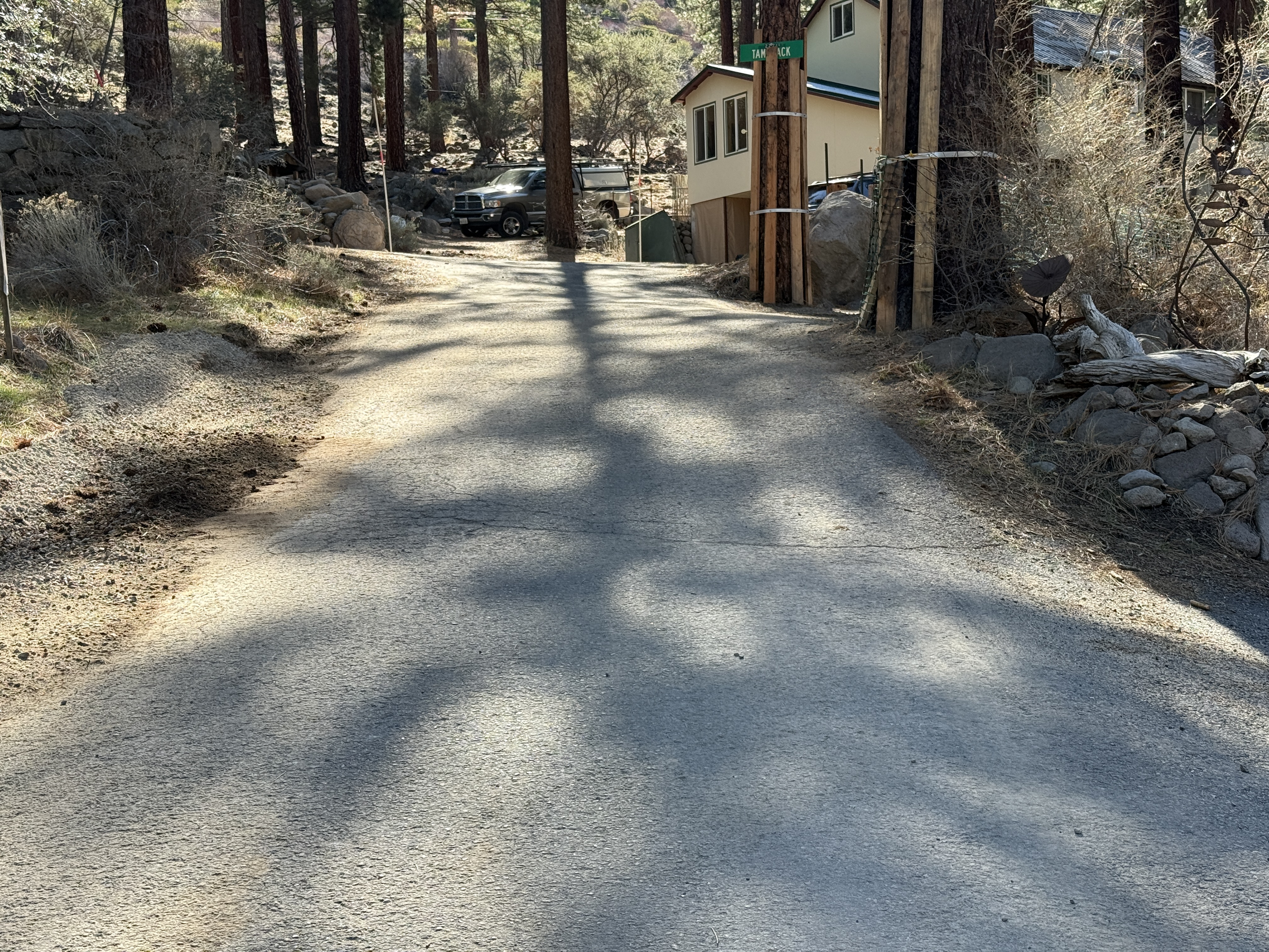 The image depicts a paved access road with shadows cast by trees in a wooded area. There is a vehicle parked to the right near a small building and boulders. The road appears to lead uphill towards forested surroundings. No active construction work is visibly taking place.