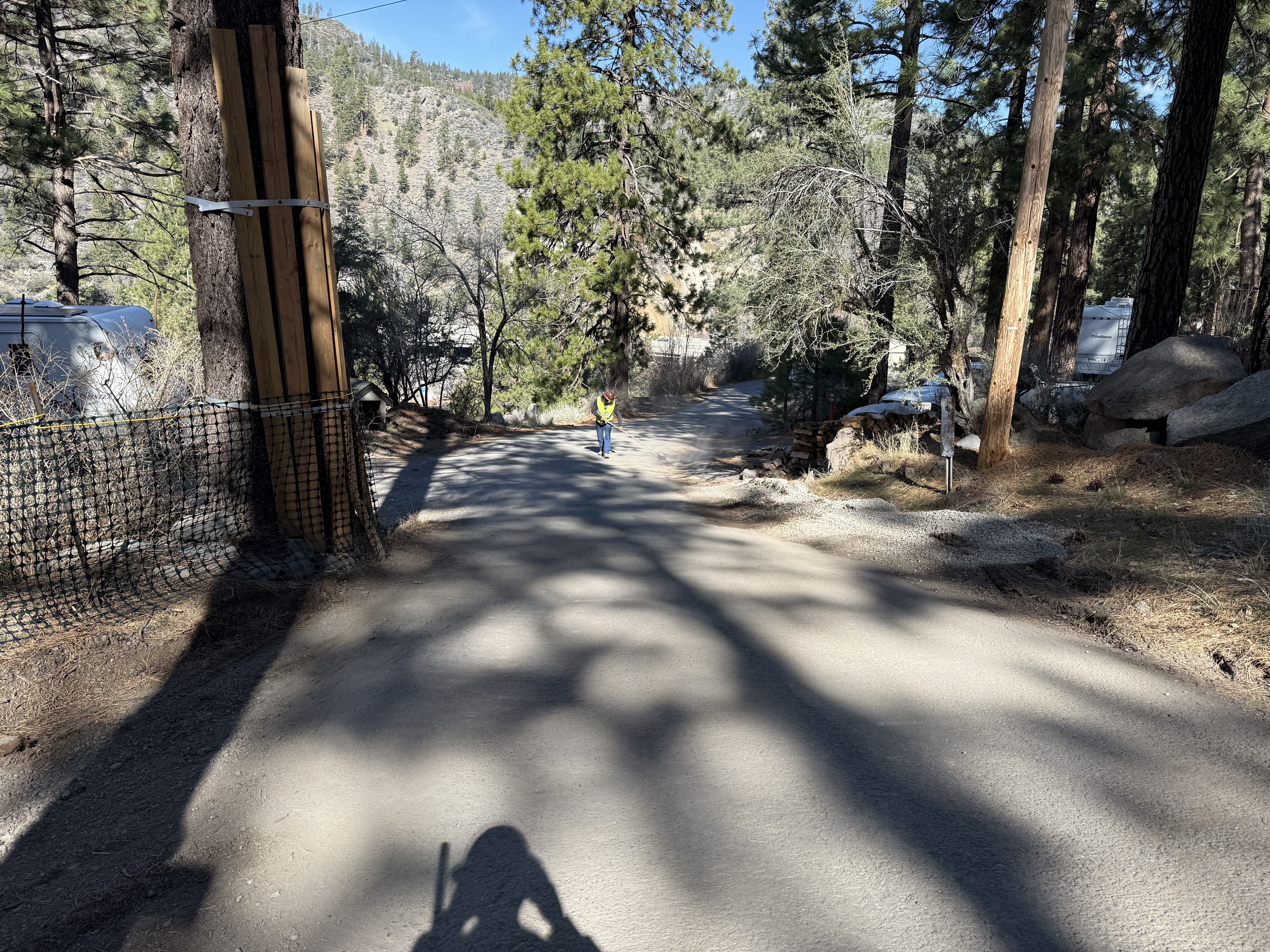 paved road surface with shadows sunny with shadows from trees open access road with some obstruction by trees and planks