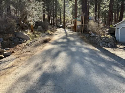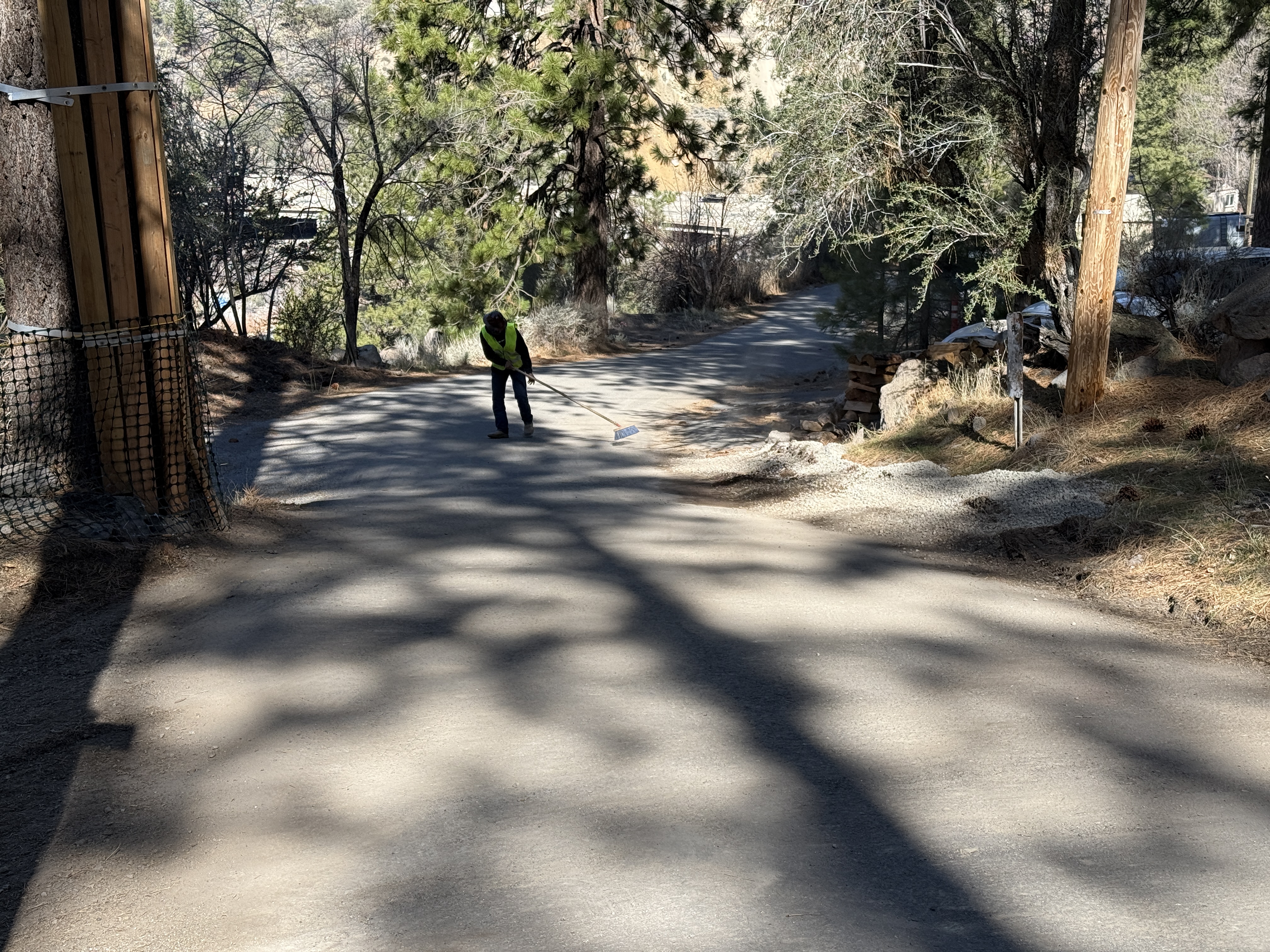 The image shows a worker using a hand tool, possibly a broom, on a paved access road in a wooded area. There is a large tree to the left with wooden supports and netting. The area appears to be in the shadow with sunlight filtering through the trees.