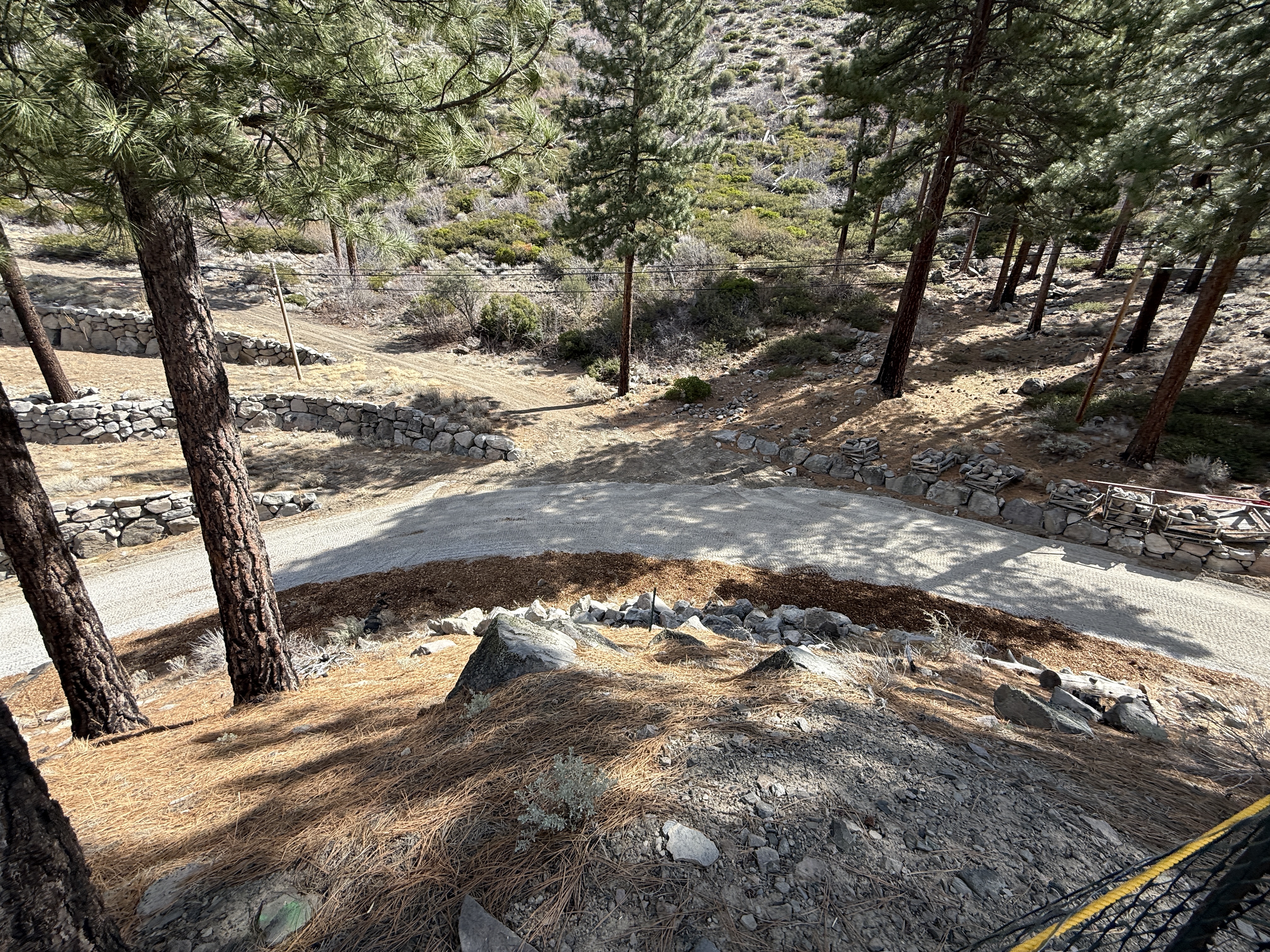 A dirt access road curves through a wooded area, with stone retaining walls lining the sides. Pine trees are present along the road, providing natural shading. The slope exhibits signs of erosion control, such as rock barriers. The setting appears remote with no active construction machinery or personnel visible.