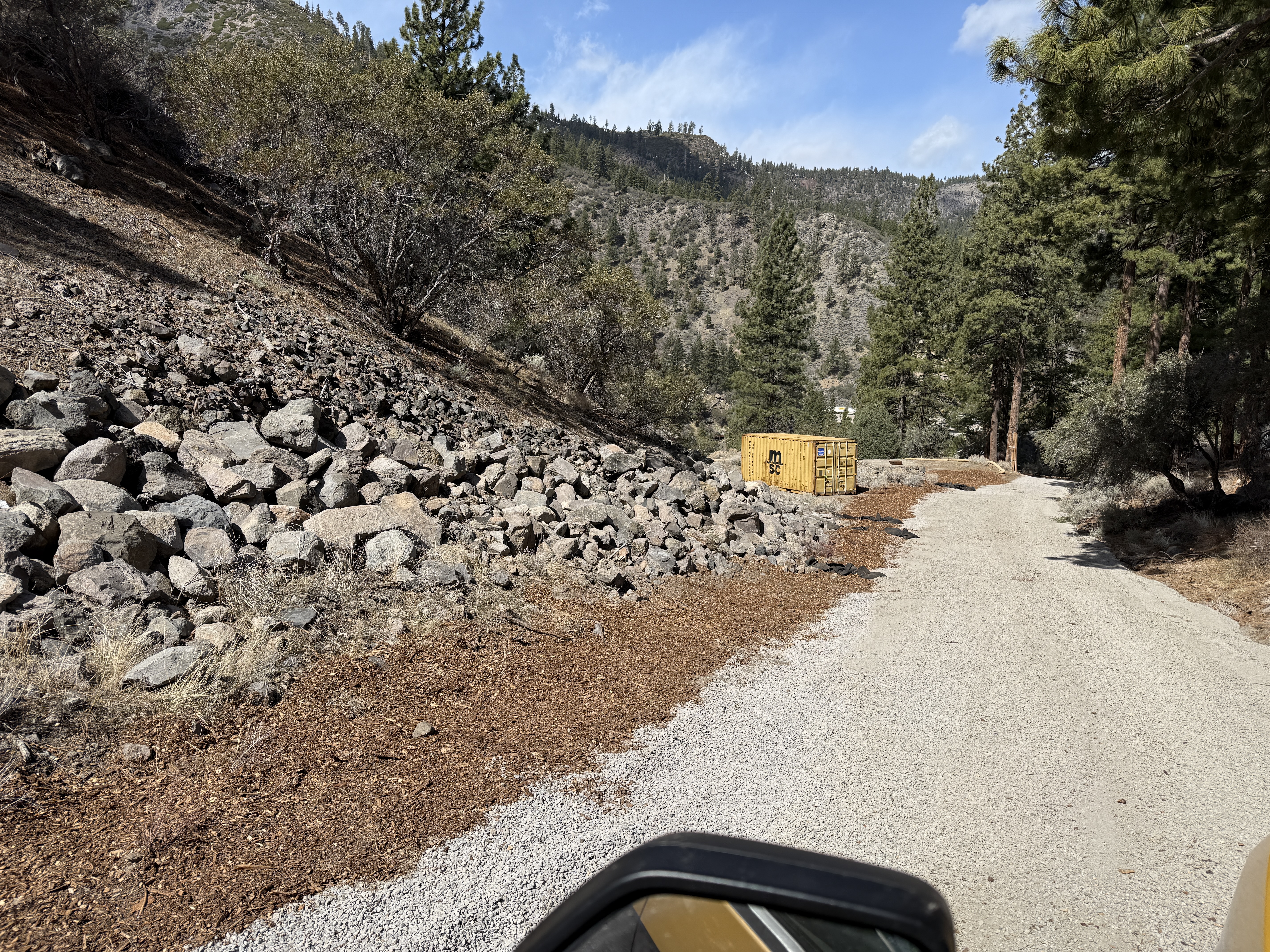 The image shows a gravel access road flanked by trees and rock embankments, leading to a yellow shipping container on the right. The road is surrounded by natural terrain with pine trees and rocks scattered along the sides. The container is positioned at the edge of the road, suggesting possible use as temporary site storage.