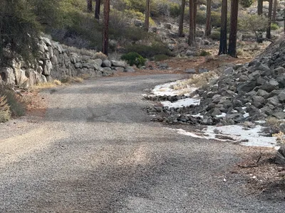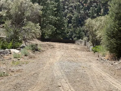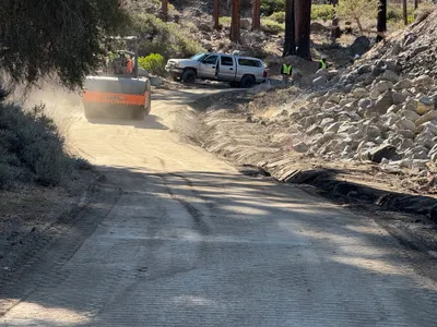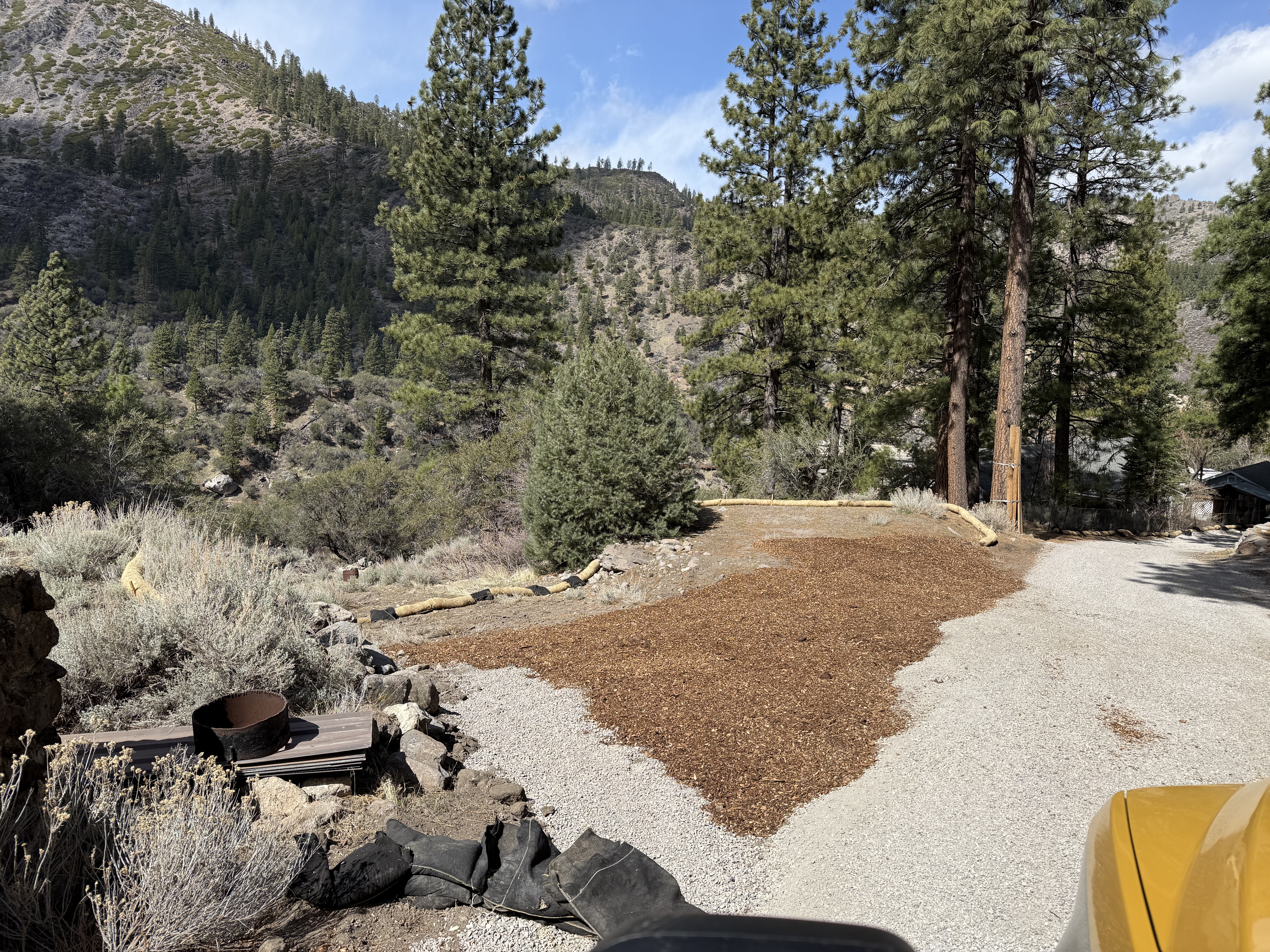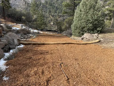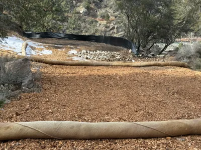 The image depicts an area with site grading in progress on an access road. There is a section of gravel and mulch laid out on the ground with erosion control materials, such as wattles, placed along the edge. The landscape includes trees and shrubs with a backdrop of hills. No active machinery or personnel are present.