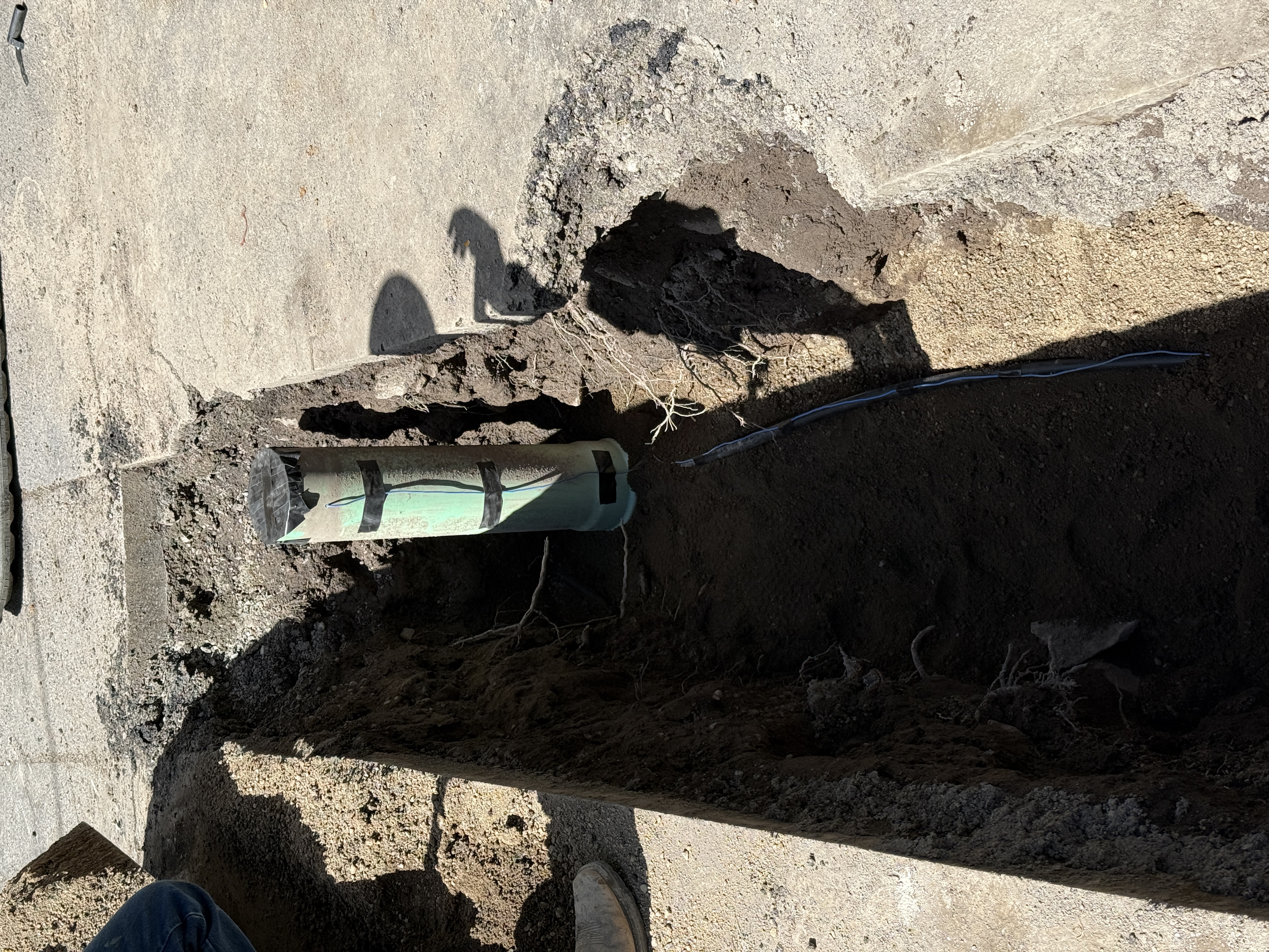 dirt and disturbed soil with adjacent pavement clear lighting suggesting daylight open trench with adjacent pavement