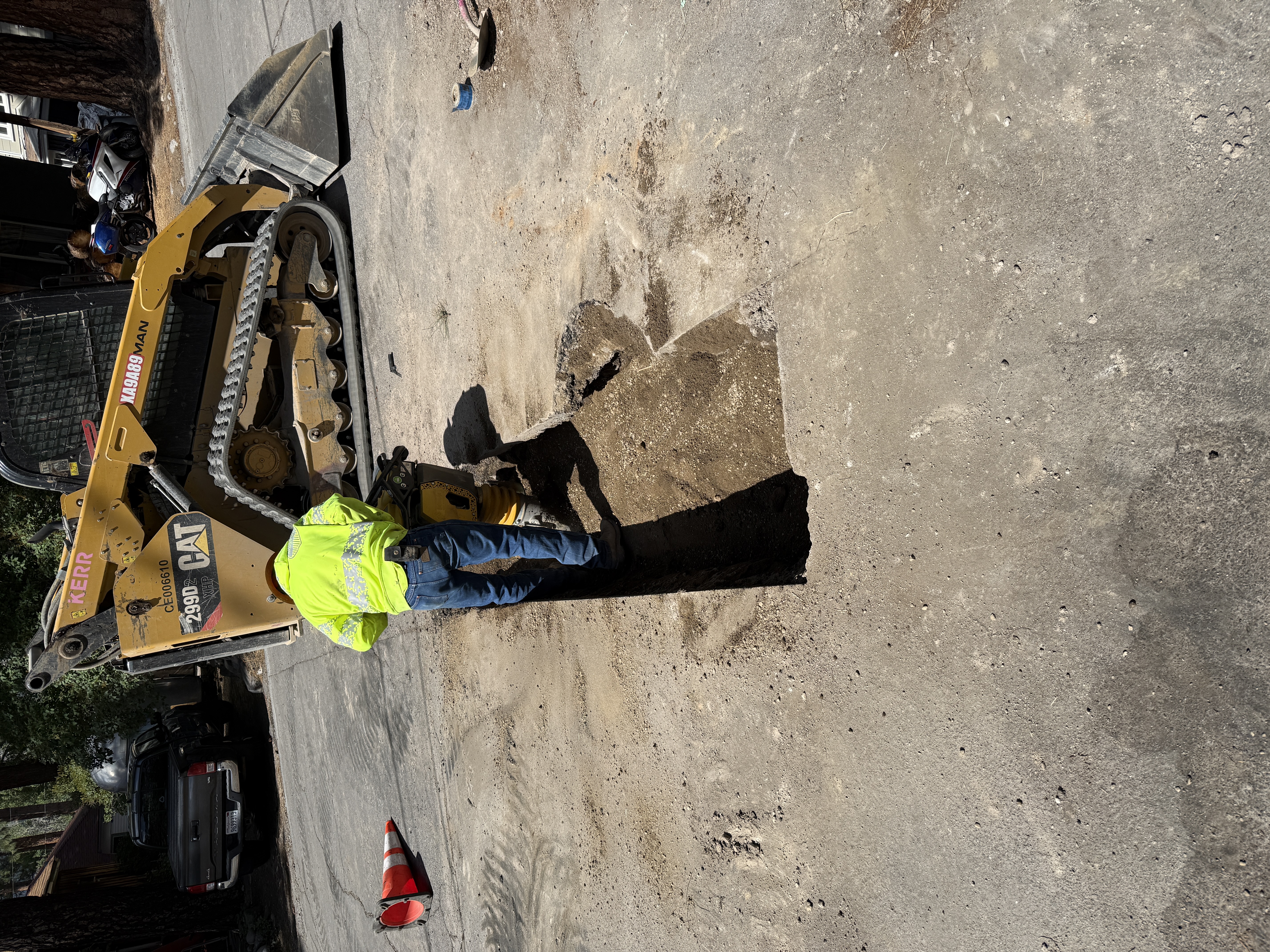 The image shows a worker in hi-vis clothing operating a piece of machinery near a freshly excavated trench in the pavement. A compact track loader is parked adjacent to the trench, with a construction cone laying on its side nearby. The street surface is partially excavated, revealing soil beneath. Some vehicles are parked off to the side.