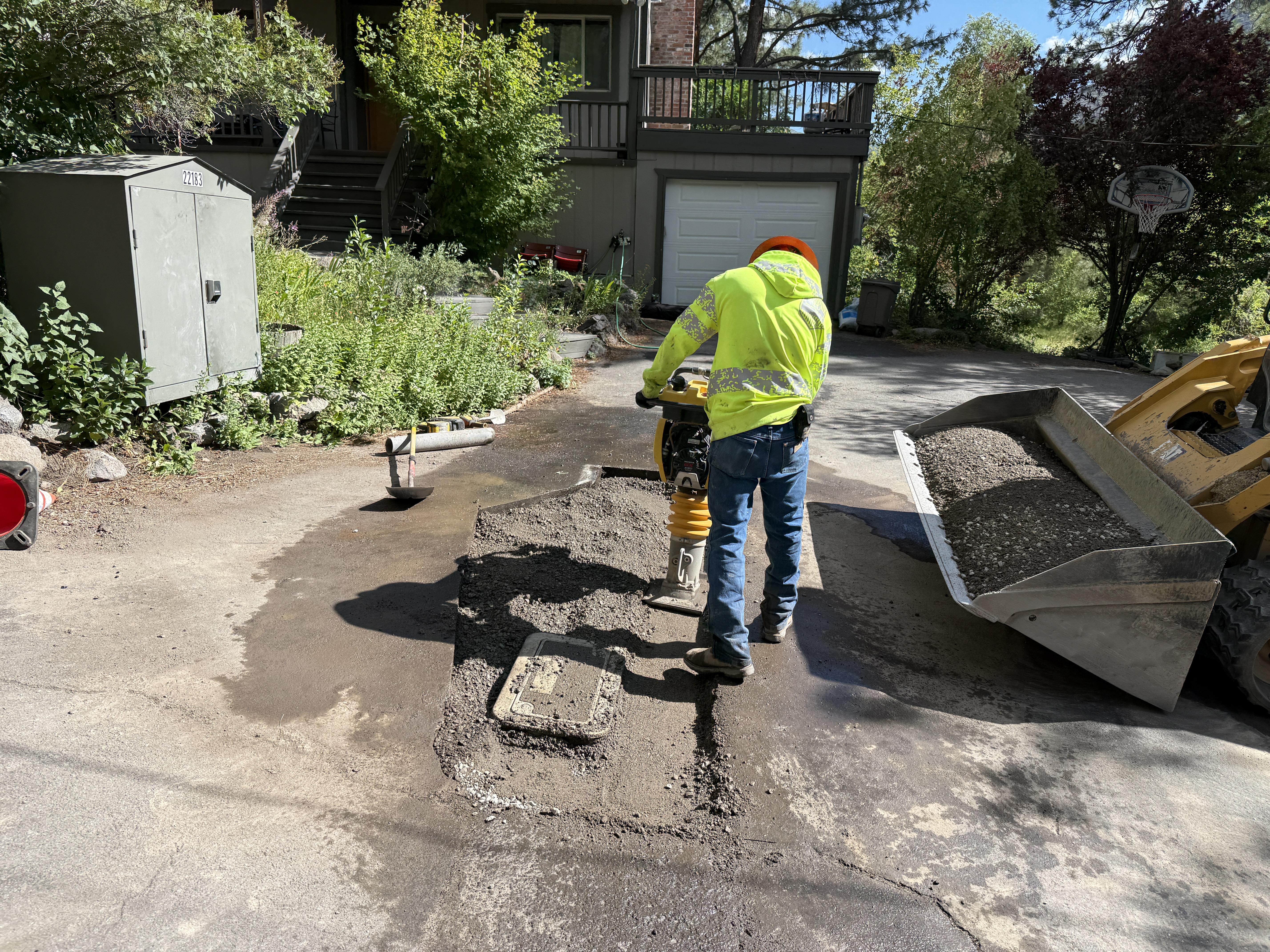 The image shows a person in a hi-vis vest and hard hat operating a compactor on a driveway area. Gravel is seen in the bucket of a skid steer loader nearby. The area appears to be a domestic setting with landscaping in the background. This scene indicates maintenance or repair work on a driveway surface.