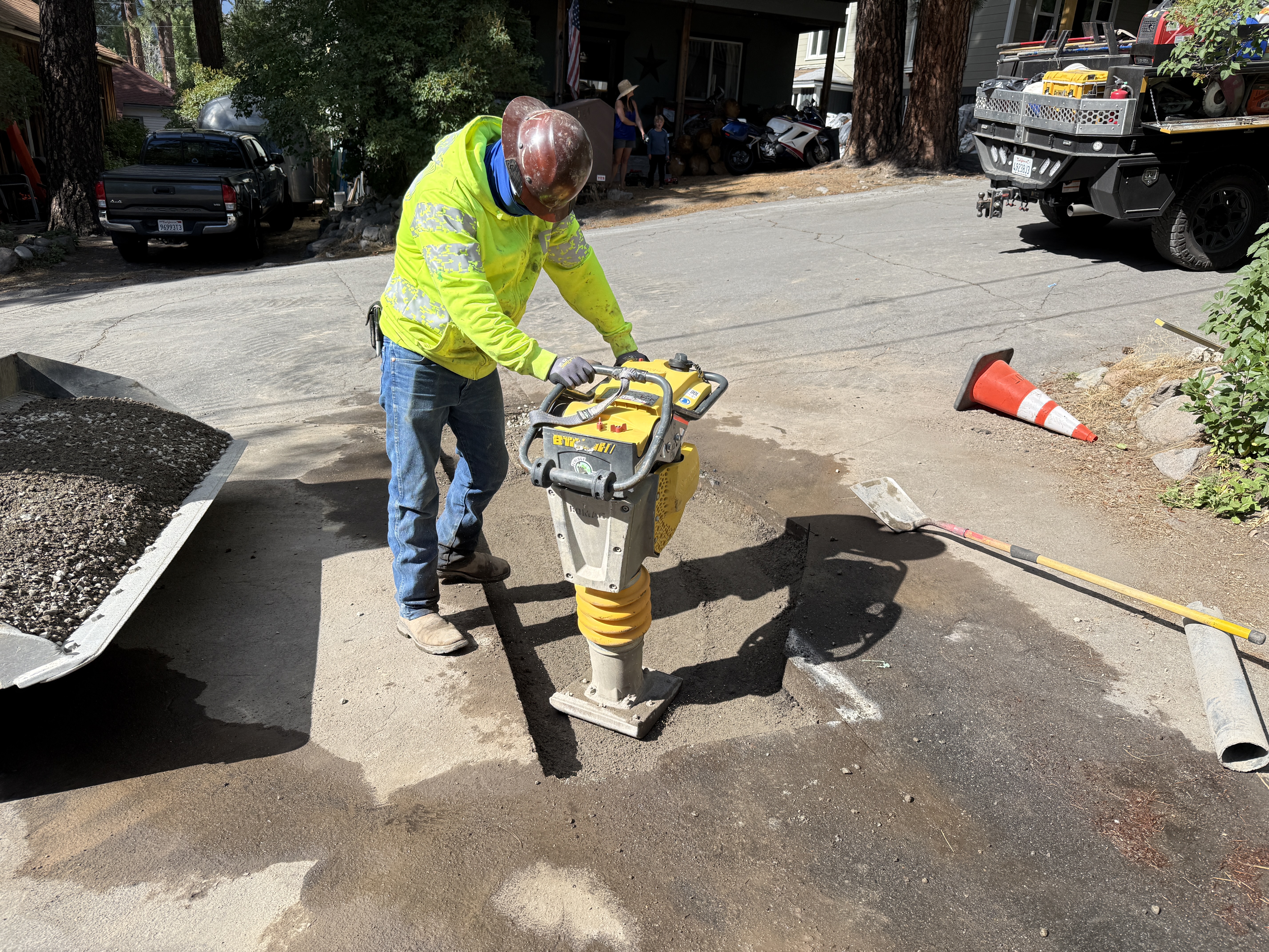 The image shows a construction worker using a compactor on a paved area. The worker is wearing a hard hat, hi-vis vest, and work boots. Nearby, a traffic cone and a shovel are visible, suggesting ongoing ground repair or compaction work. The surroundings include vehicles and a residential backdrop.