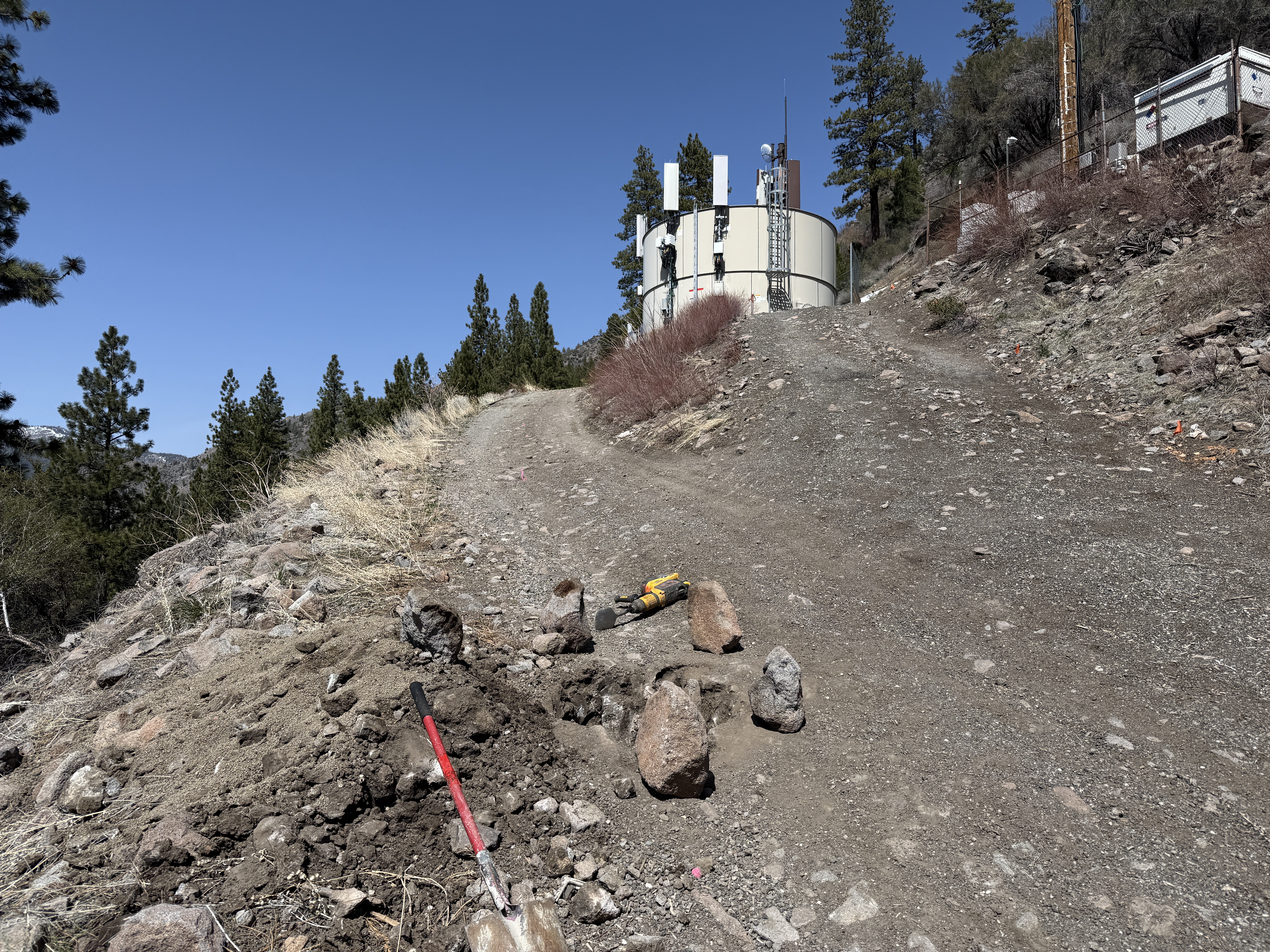 The image shows an area where excavation appears to be happening, with a shovel on a dirt road. There are rocks and soil scattered near the path, indicating recent digging activity. In the background, a fenced facility with tall structures is visible, possibly related to water treatment. The path leading to the facility is unpaved and slopes upward.