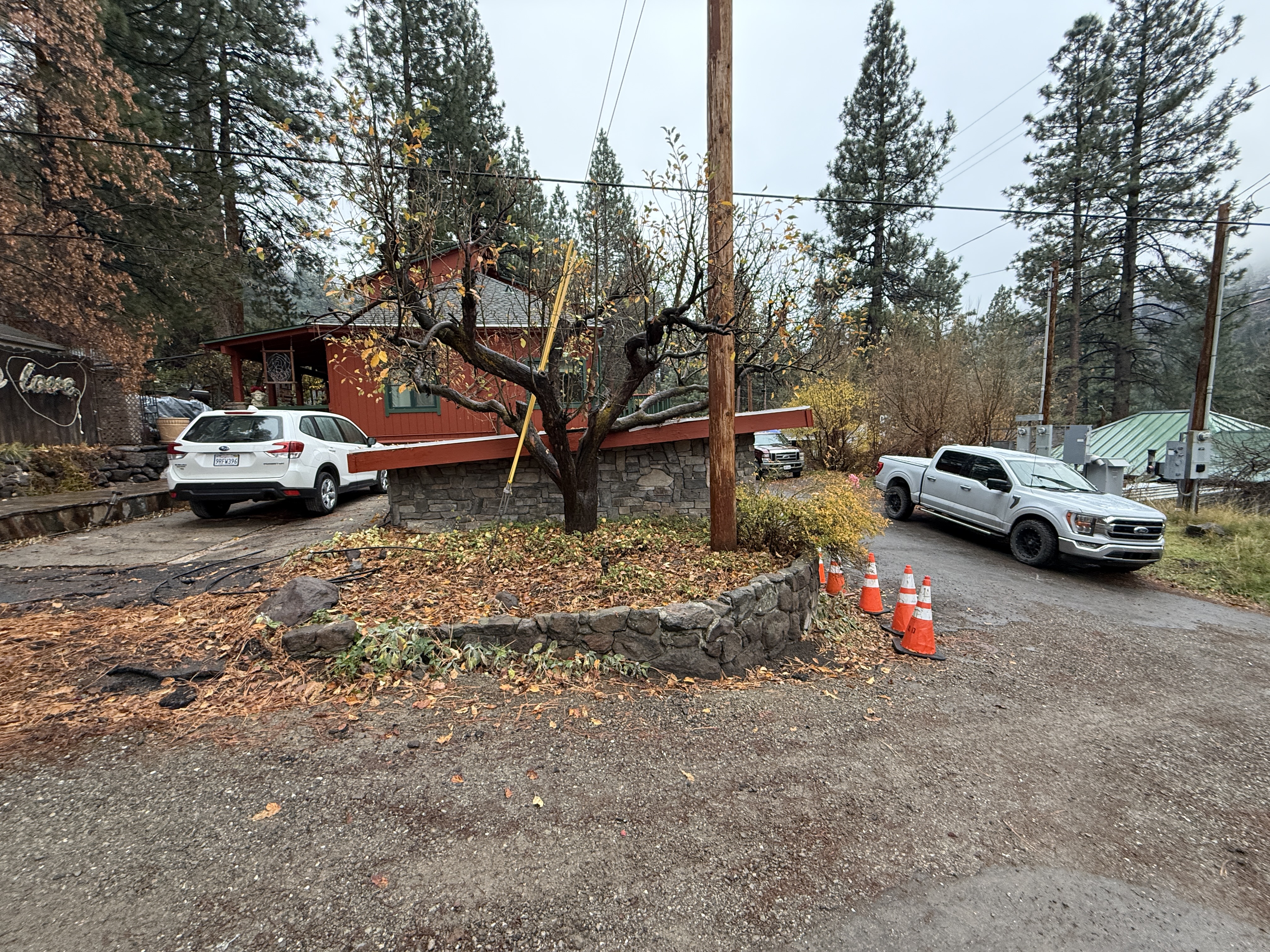The image shows a parking area with several vehicles including a white SUV and a white pickup truck. Traffic cones are placed near the vehicles. The scene is surrounded by tall trees, and a small building with red siding and a pitched roof is visible. The ground appears to be covered in leaves and wet from recent rain.