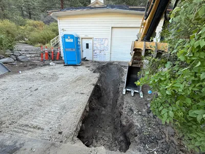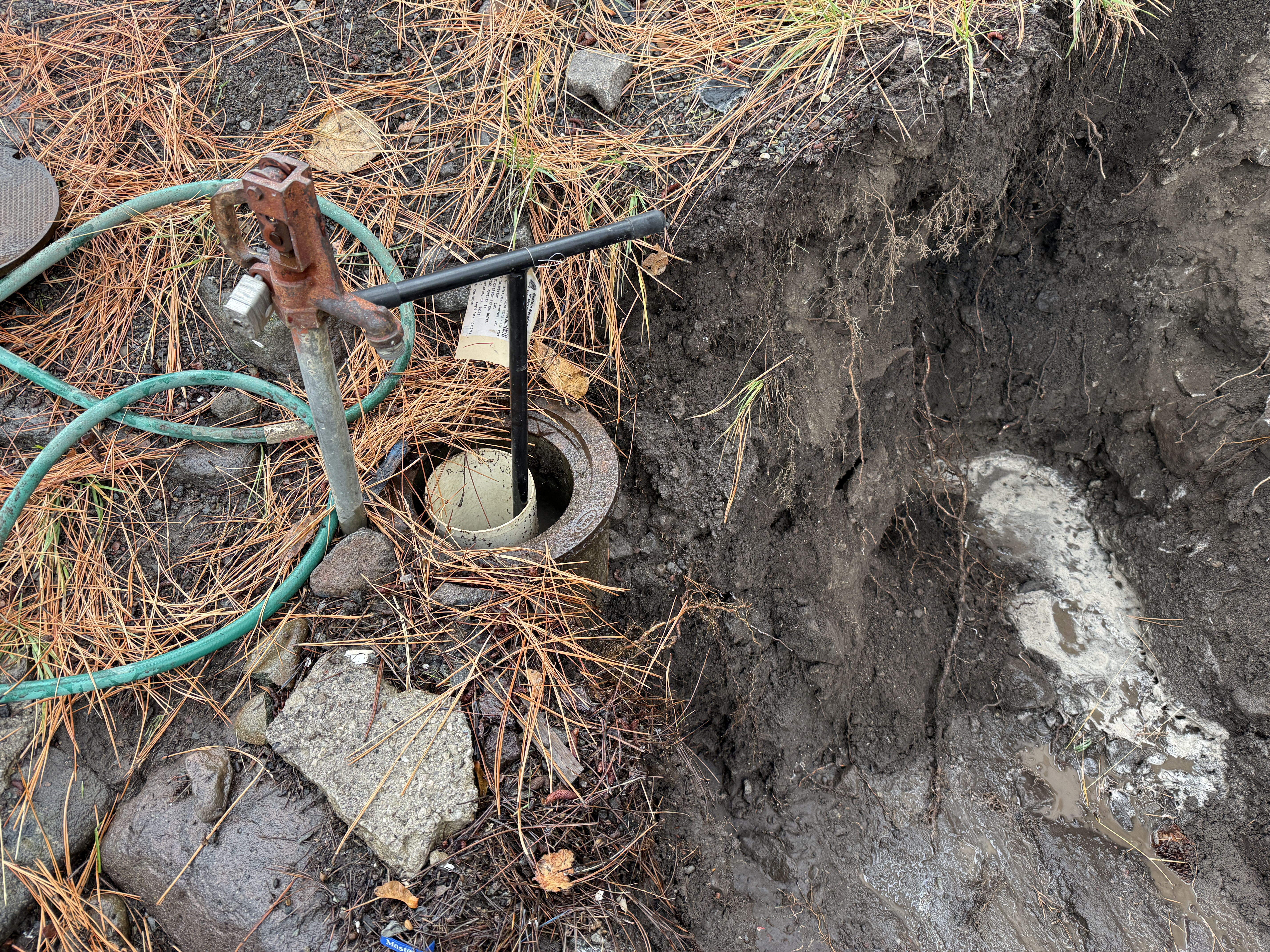 The image shows an old water spigot with an attached green hose positioned near an open excavation. There is a pipe opening visible adjacent to the spigot. The ground is covered with pine needles and appears to be muddy with exposed soil. The excavation reveals a potential trench or cavity with wet conditions, and some concrete or similar material is visible within the cut soil area.