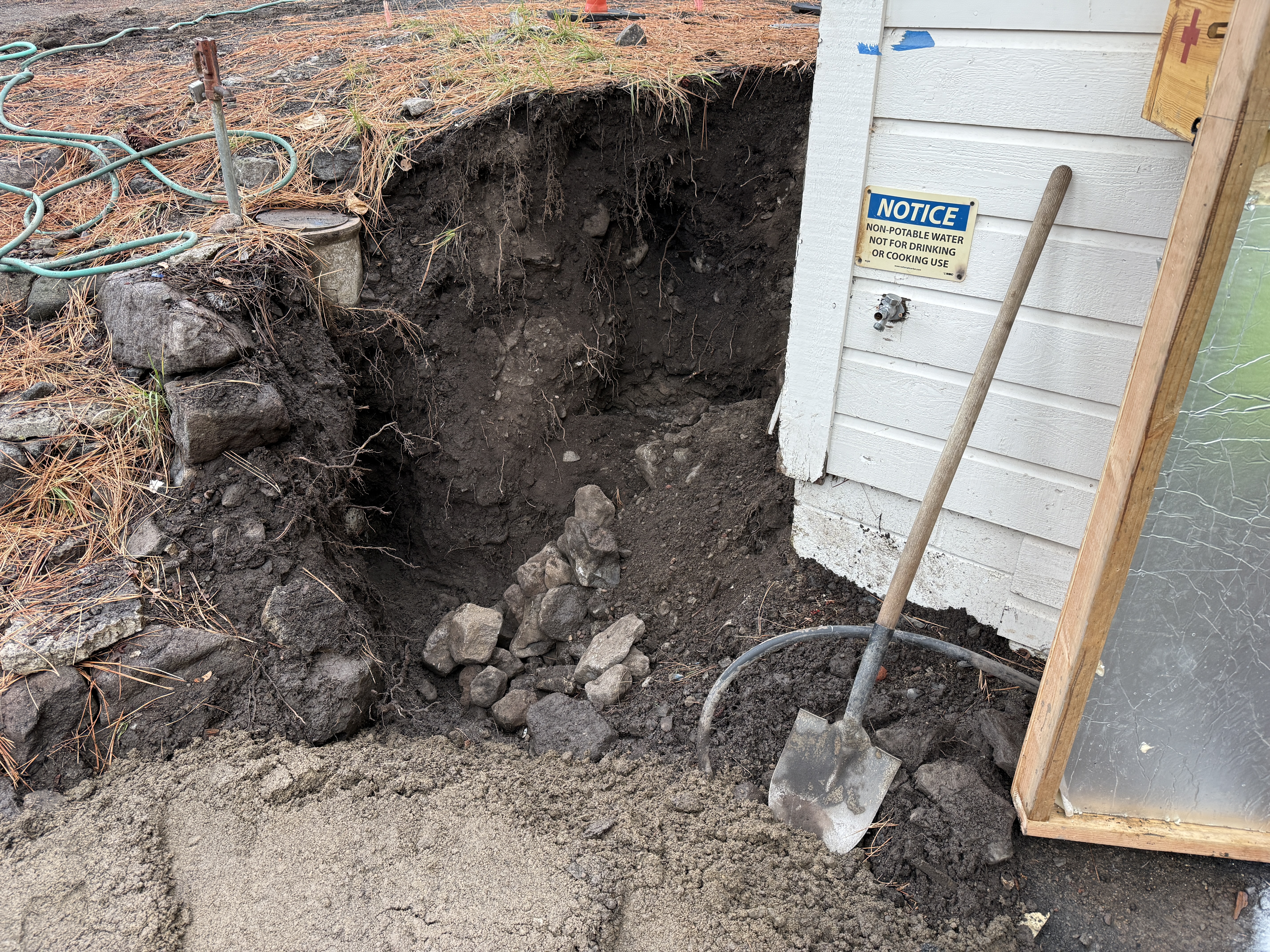 The image shows an excavation site adjacent to a building wall with a sign indicating non-potable water. A shovel is leaning against the wall, and there is a hose nearby. The ground is uneven, and a pile of rocks is present within the excavated area.