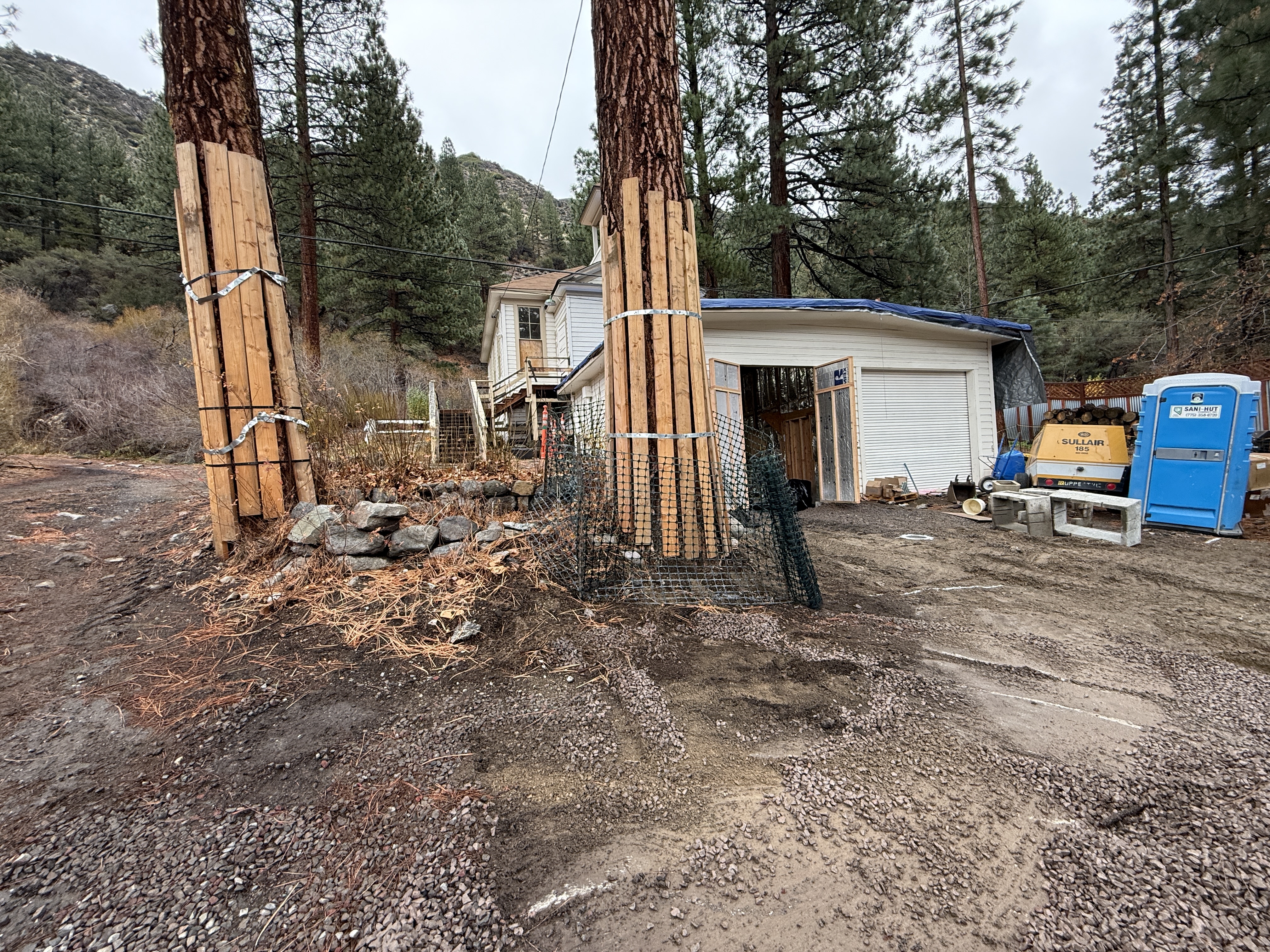The image shows a construction site area with large trees secured by wooden planks and straps. To the right, there's a portable toilet and equipment such as a Sullair compressor staged beside a garage structure. The ground is uneven with gravel and soil, indicating recent site disturbance or grading. This setup suggests preparation work or staging, not active construction.