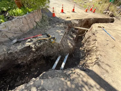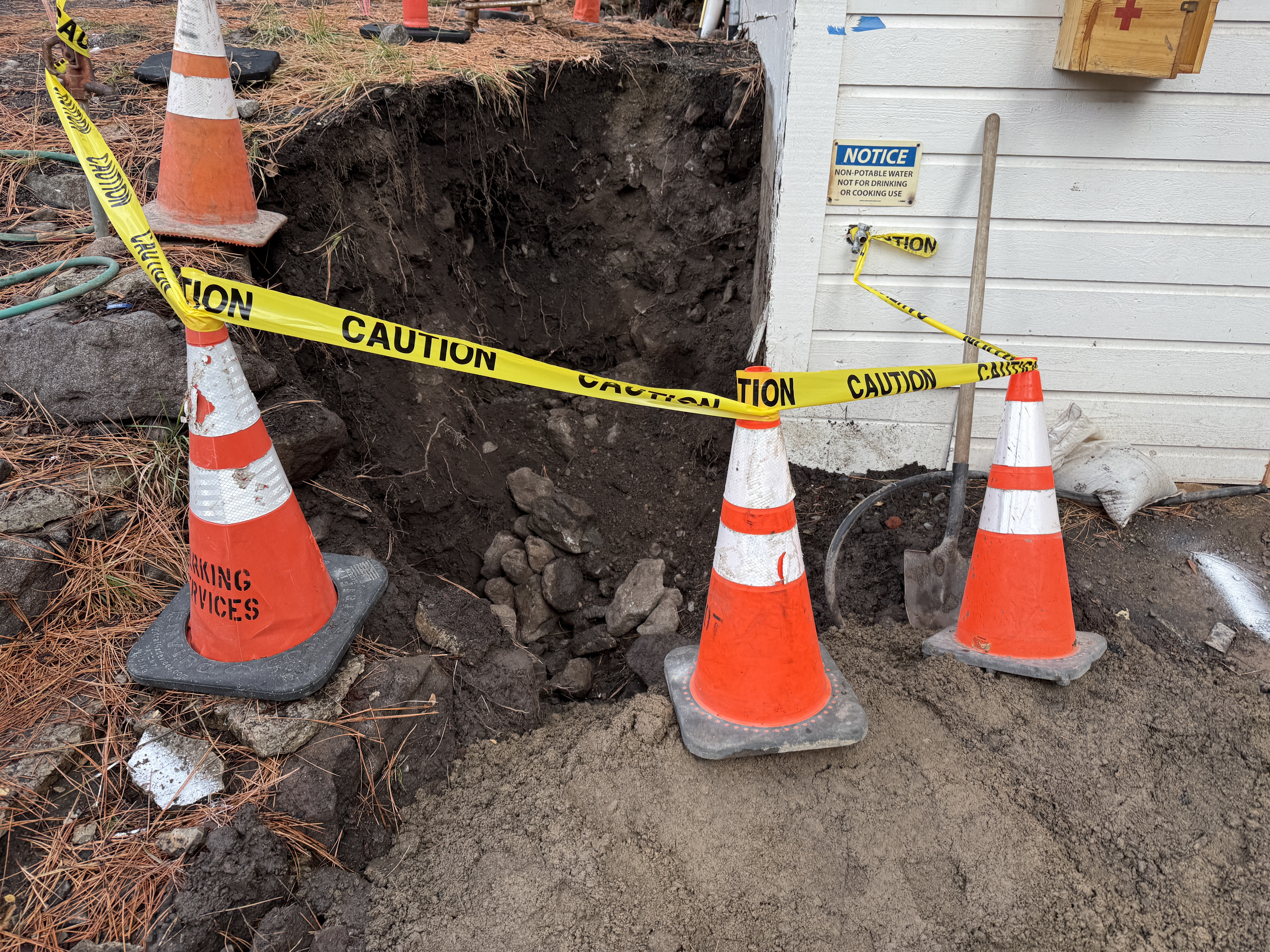 The image shows an open trench area bordered by orange traffic cones and wrapped with yellow caution tape for safety. A shovel is standing against the nearby structure, which has a notice sign warning about non-potable water. The surface around the trench appears to be a mix of soil and rock debris, indicating excavation activity.