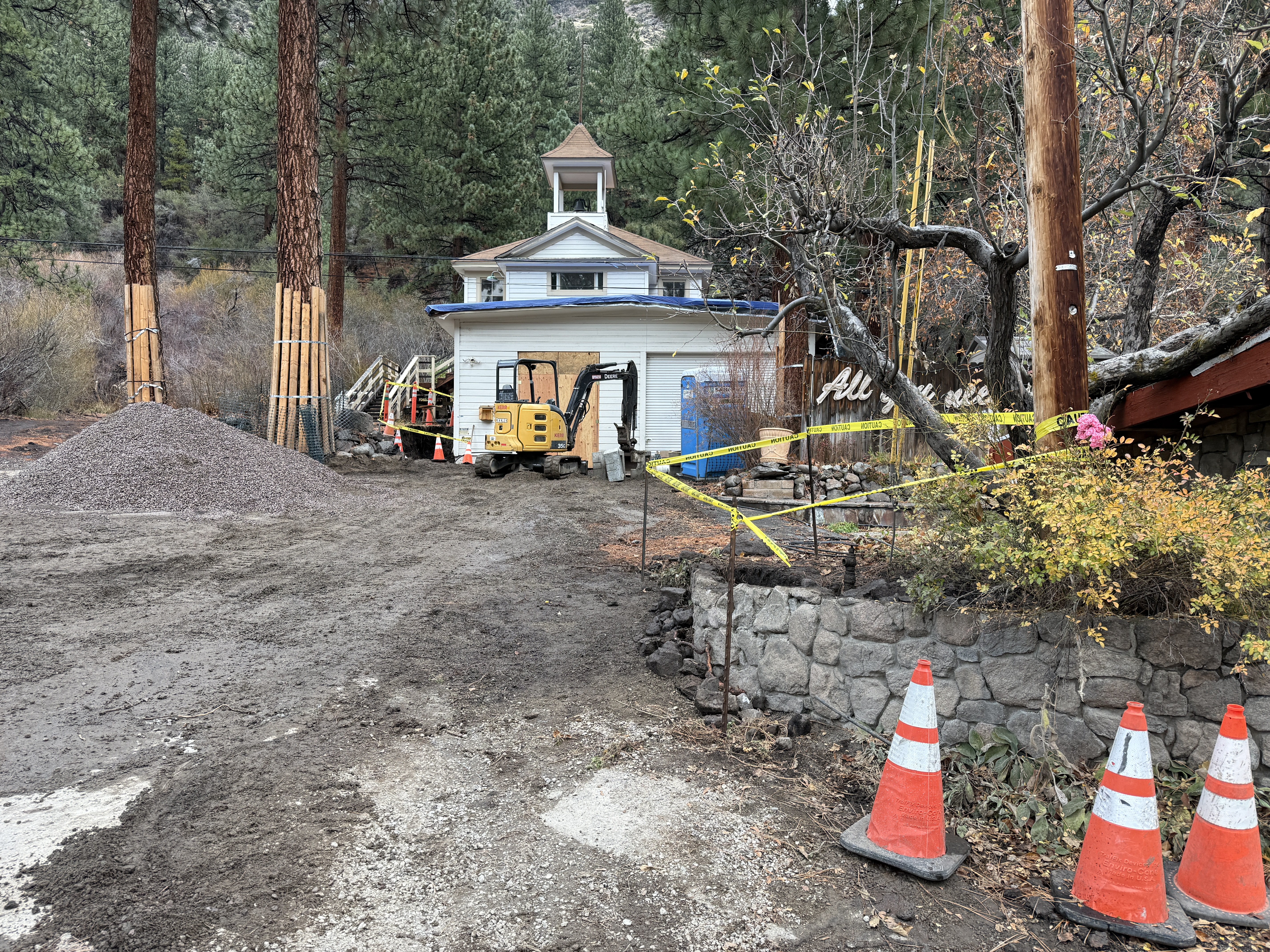 The image shows a construction area in front of a small building with a bell tower. A compact excavator is present, and a large pile of gravel is visible on the left side near two trees wrapped with protective materials. Caution tape and orange traffic cones mark off certain areas, suggesting site preparation or grading is underway. There is no visible trenching, but ground disturbance is evident.