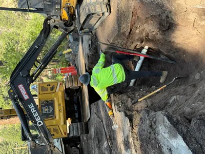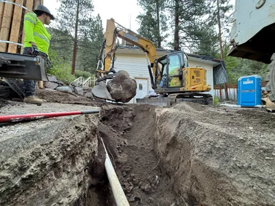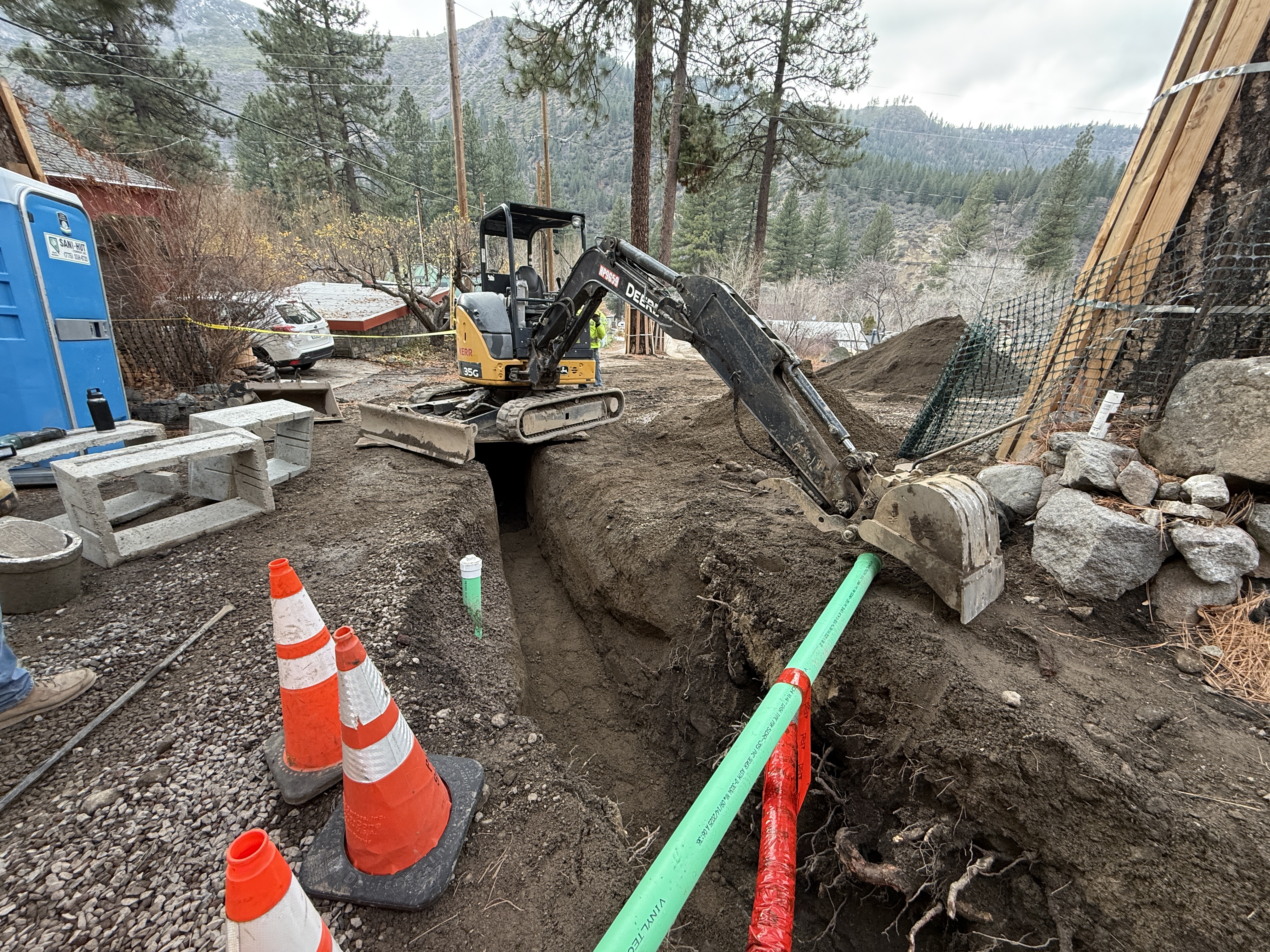 An excavator is actively working in a trench, which contains visible PVC pipes. Orange cones are placed near the trench for safety. The surrounding area includes portable restrooms and concrete blocks. The terrain appears to be uneven with vegetation and mountainous background.