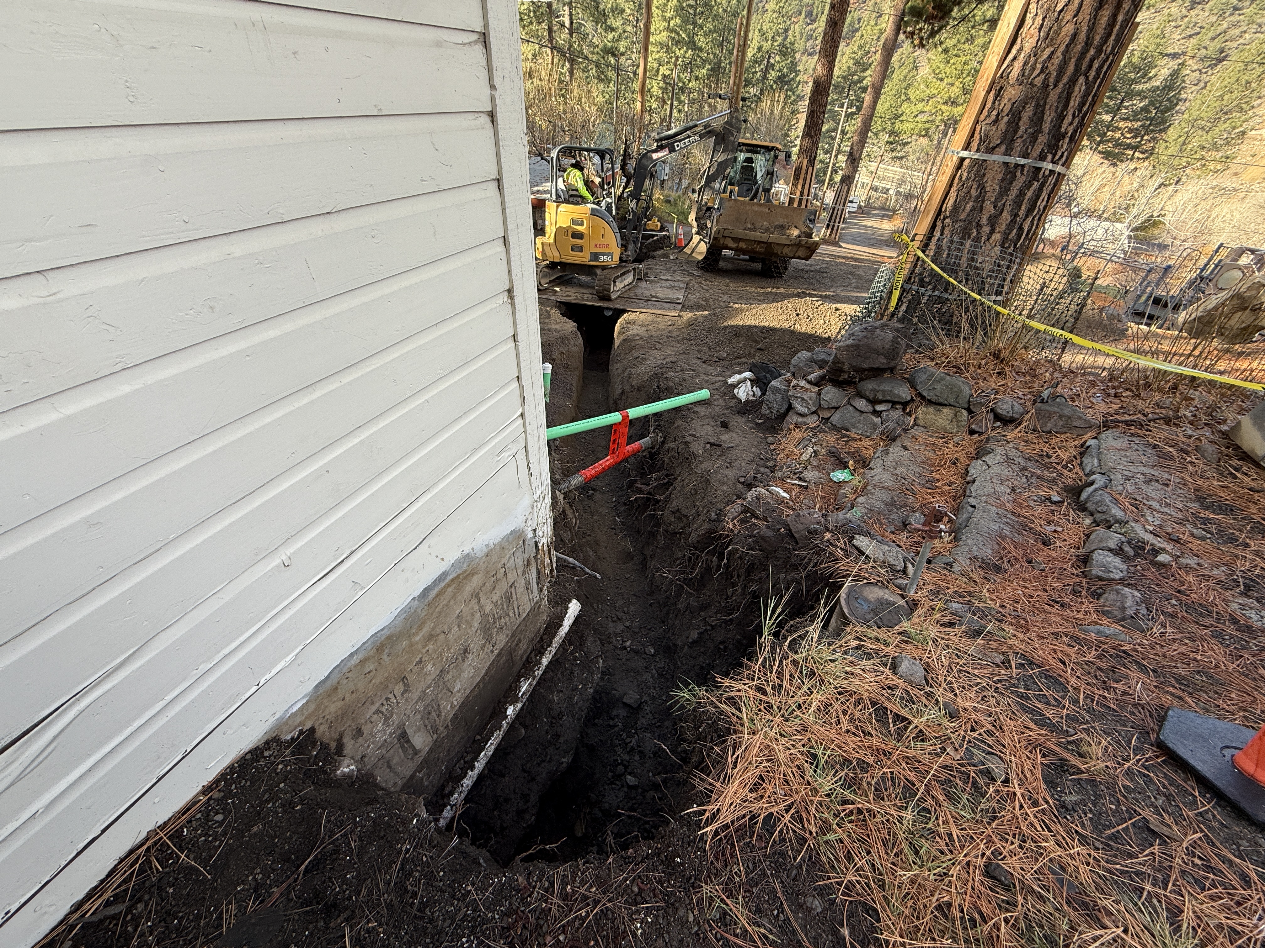 A deep trench runs alongside the foundation of a building, with excavation equipment visible in the background. The trench is bordered by soil, and caution tape is strung between nearby trees. Utility markings are present within the trench area. Workers appear to be engaged in site excavation near a wooded area.
