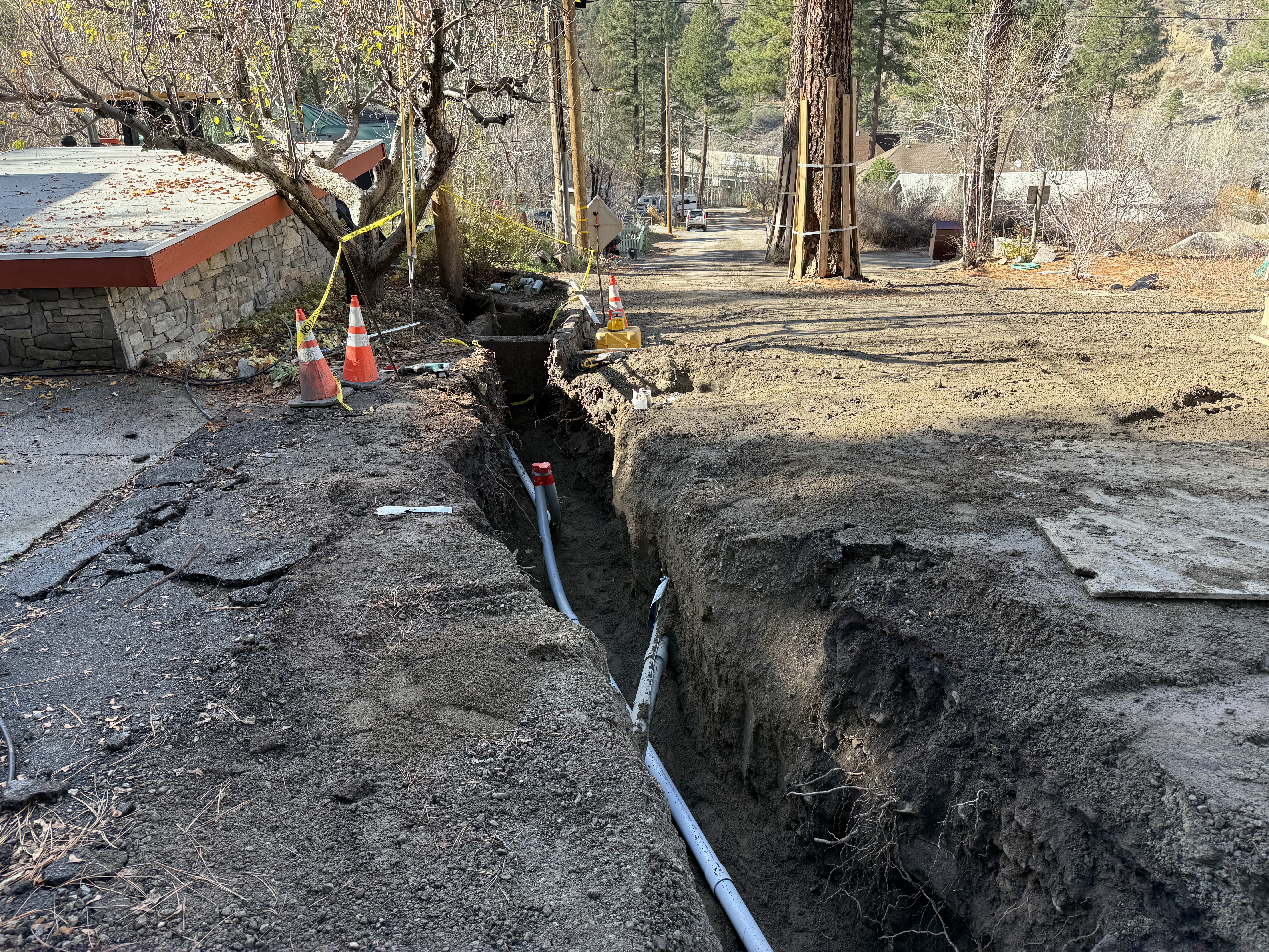 The image shows a trench running parallel to a road with exposed piping inside. Traffic cones and caution tape are positioned near the adjacent sidewalk to mark the area. The surroundings include trees and residential structures, and there are no active workers visible. This appears to be utility-related trenching work possibly for pipe installation.