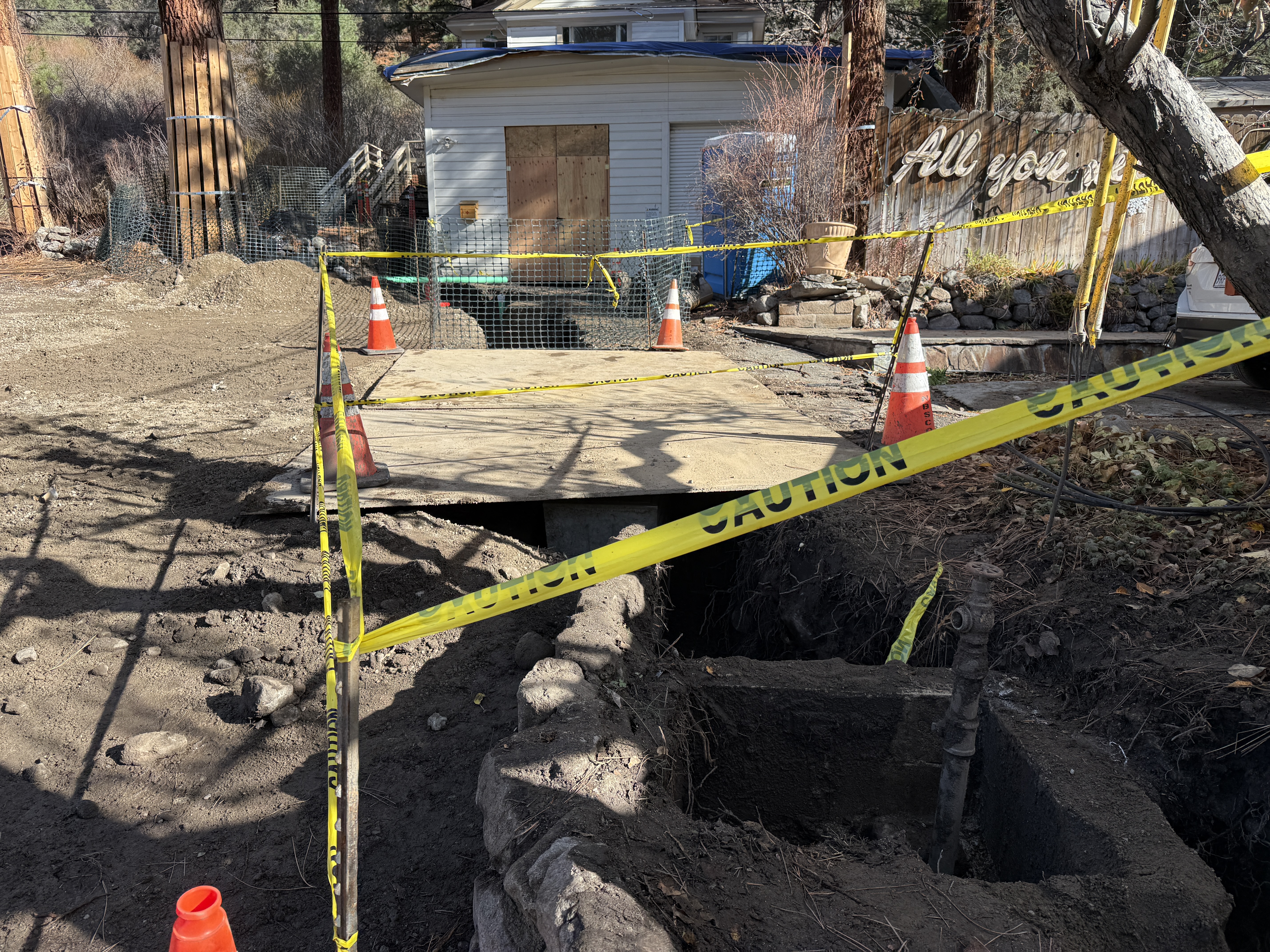 The image shows a trench on a construction site covered with plywood and surrounded by caution tape and cones. There is an open trench visible with a pipe inside, likely indicating utilities work. The area is dry soil and appears to be secured with temporary barriers.