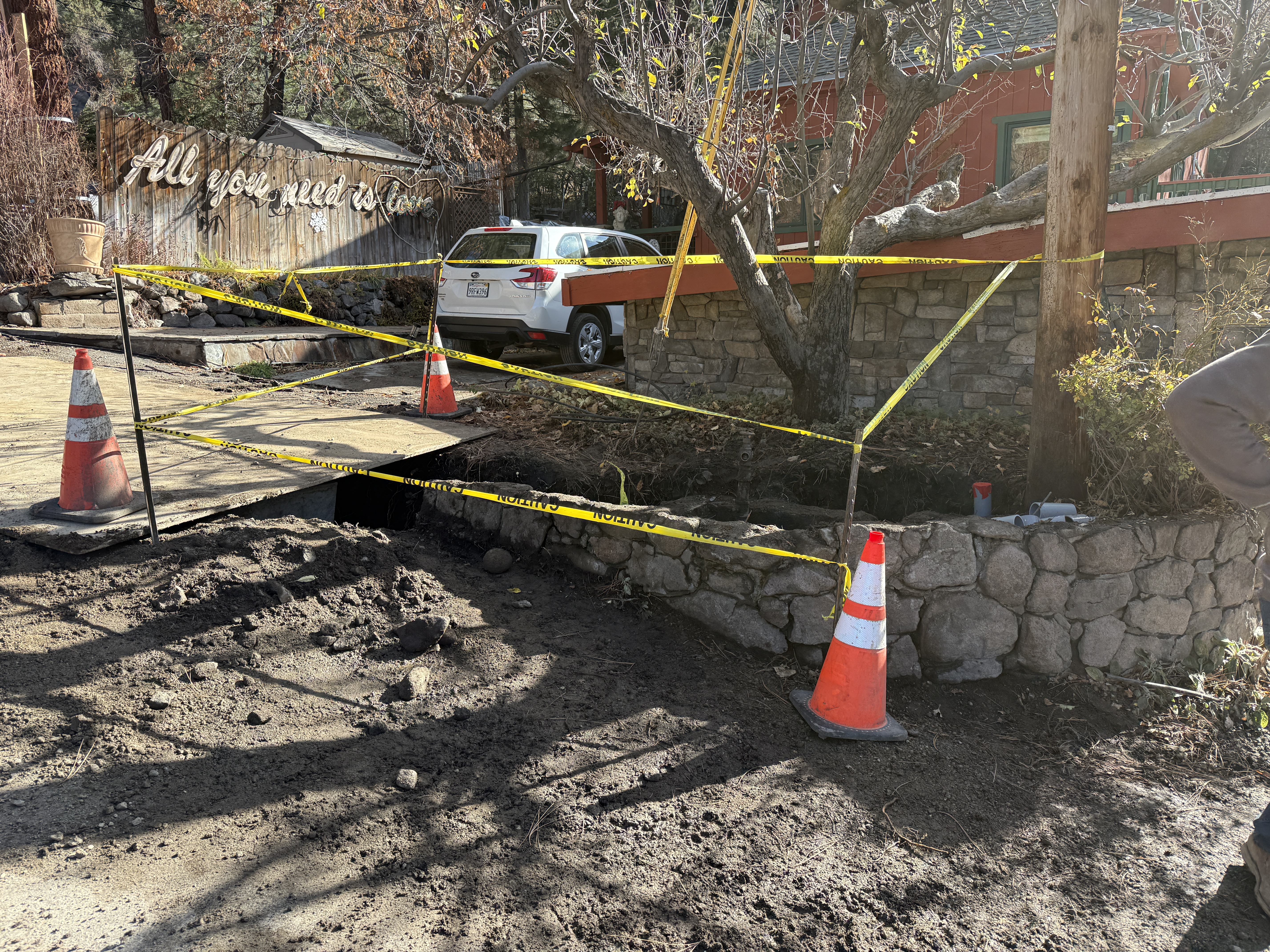 In the image, there is a section of ground that appears to be under construction with caution tape and traffic cones marking the area. A utility pole and stone retaining wall are near the work zone, with a tree also present. There is a white vehicle parked close to the site, and a fence in the background with a decorative sign that reads 'all you need is love'. The dirt surface looks disturbed, suggesting recent excavation activity.