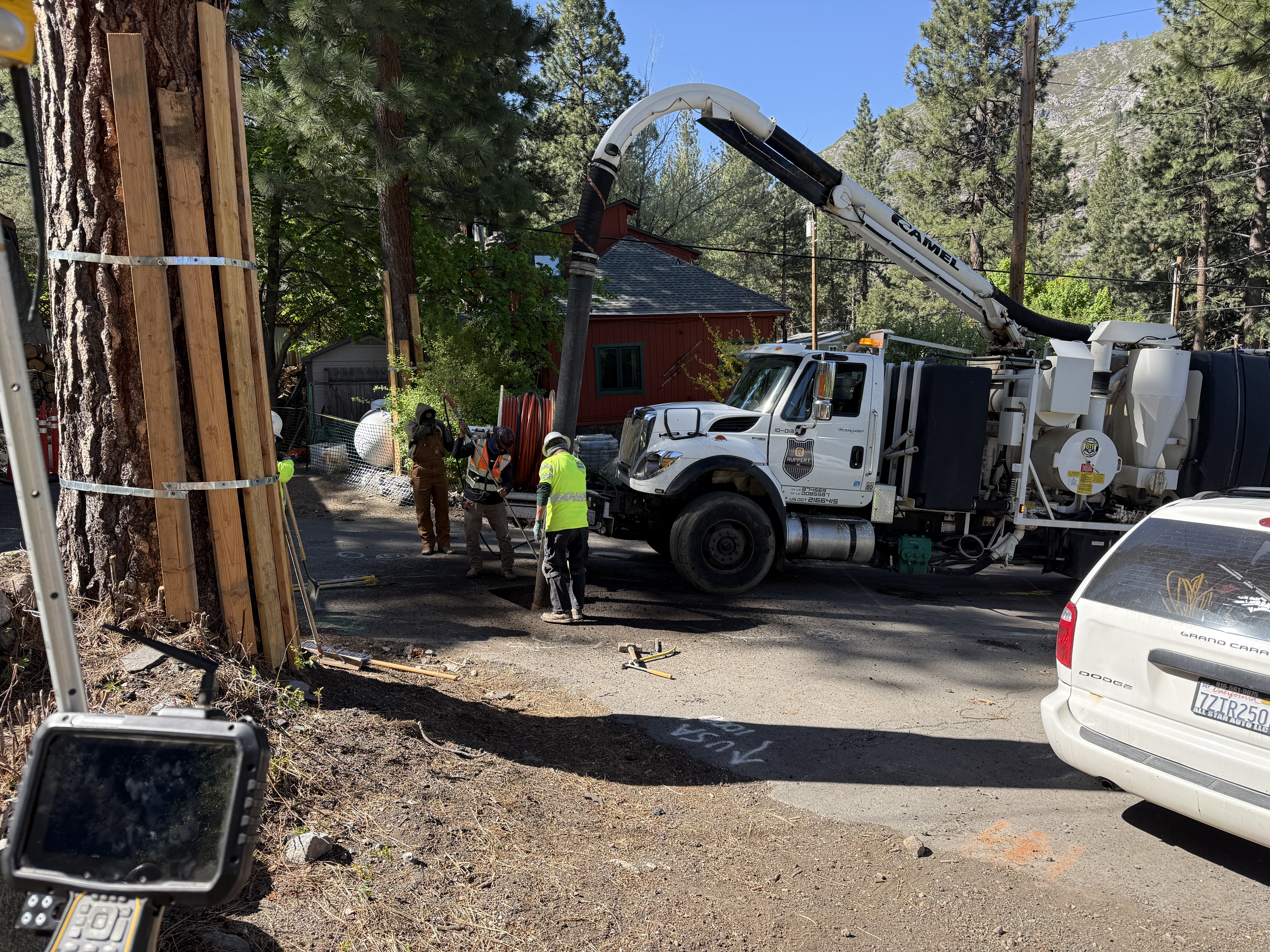 The image shows utility potholing taking place in a wooded area next to a residential-looking structure. A vacuum truck labeled 'GAMEL' is positioned with its hose extended, potentially being used for excavation. Workers are wearing hard hats, hi-vis vests, and work boots indicating compliance with safety protocols. The scene includes a tree reinforced with wooden planks on the left, and there are a few vehicles parked nearby.