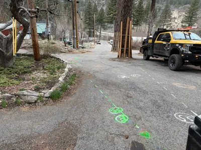 The image shows a rectangular excavation with a cross-section of a pipe visible beneath the ground. A traffic cone marked 'Parking Services' is positioned near the pothole. The work appears to involve locating and exposing a utility line, possibly for inspection or further work. The ground is asphalt with a cutout for the excavation.