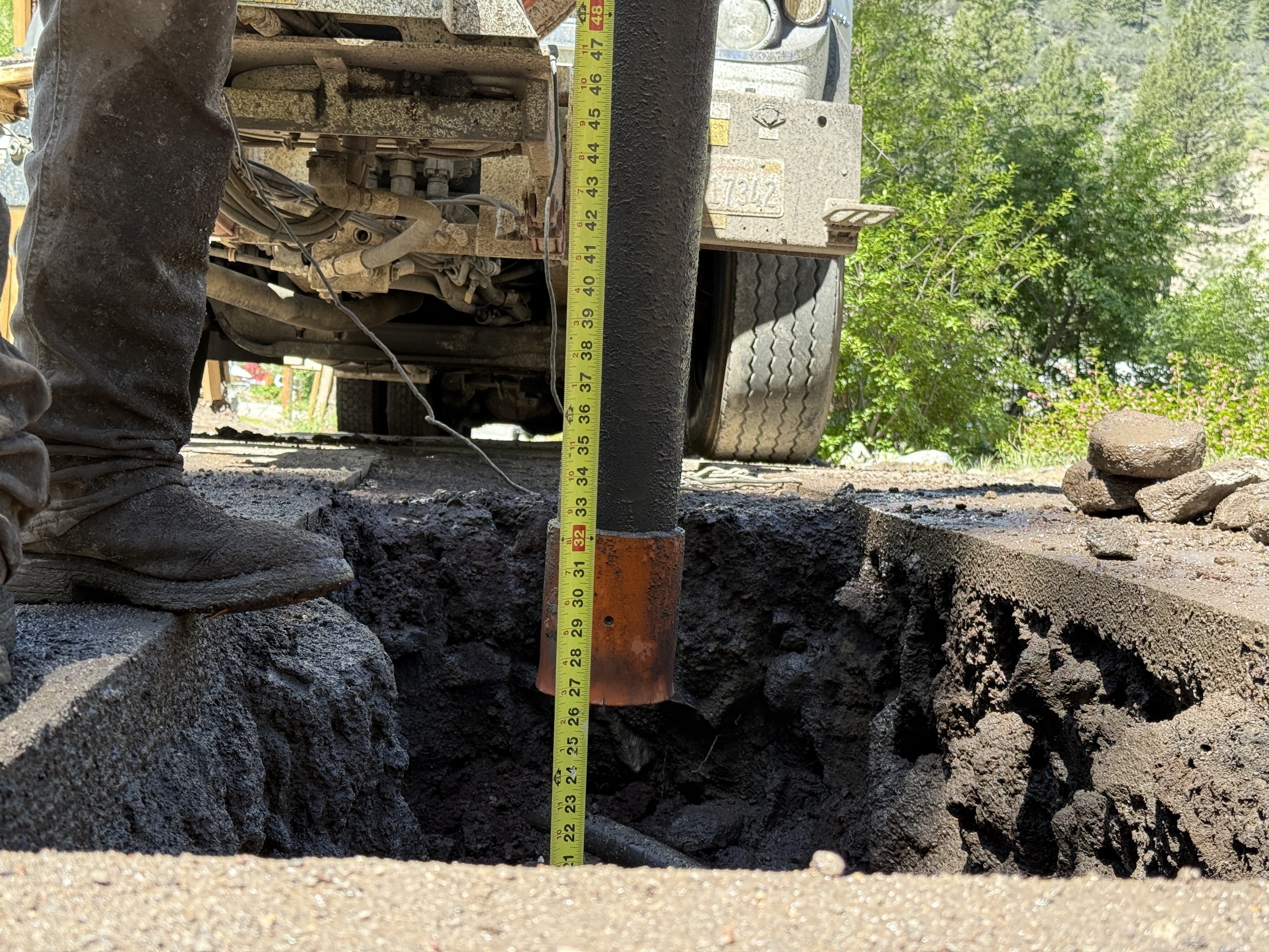 The image depicts a partially excavated trench with a person standing beside it holding a tape measure to assess the depth. A vehicle is parked near the trench, and there are chunks of excavated material next to it. The activity appears to be related to utility location through potholing, as indicated by the visible measuring process. No specific utilities are shown visually.