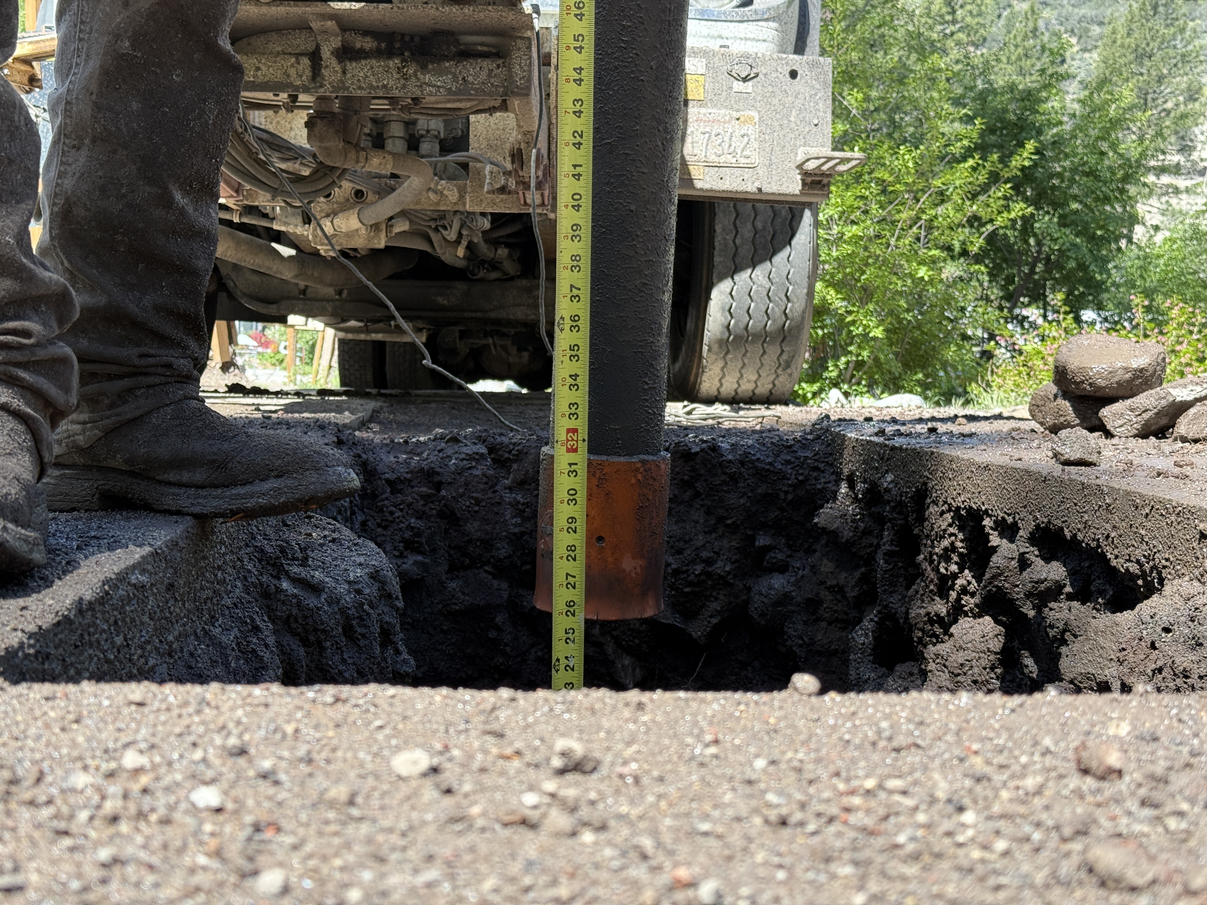 The image shows part of a person using a tape measure to ascertain the depth of an excavation or pothole in an asphalt surface. The person is standing near a partially exposed trench, with a truck visible in the background. Loose chunks of asphalt are seen near the trench edges, indicating active excavation work. The primary focus is the depth measurement of the excavation.