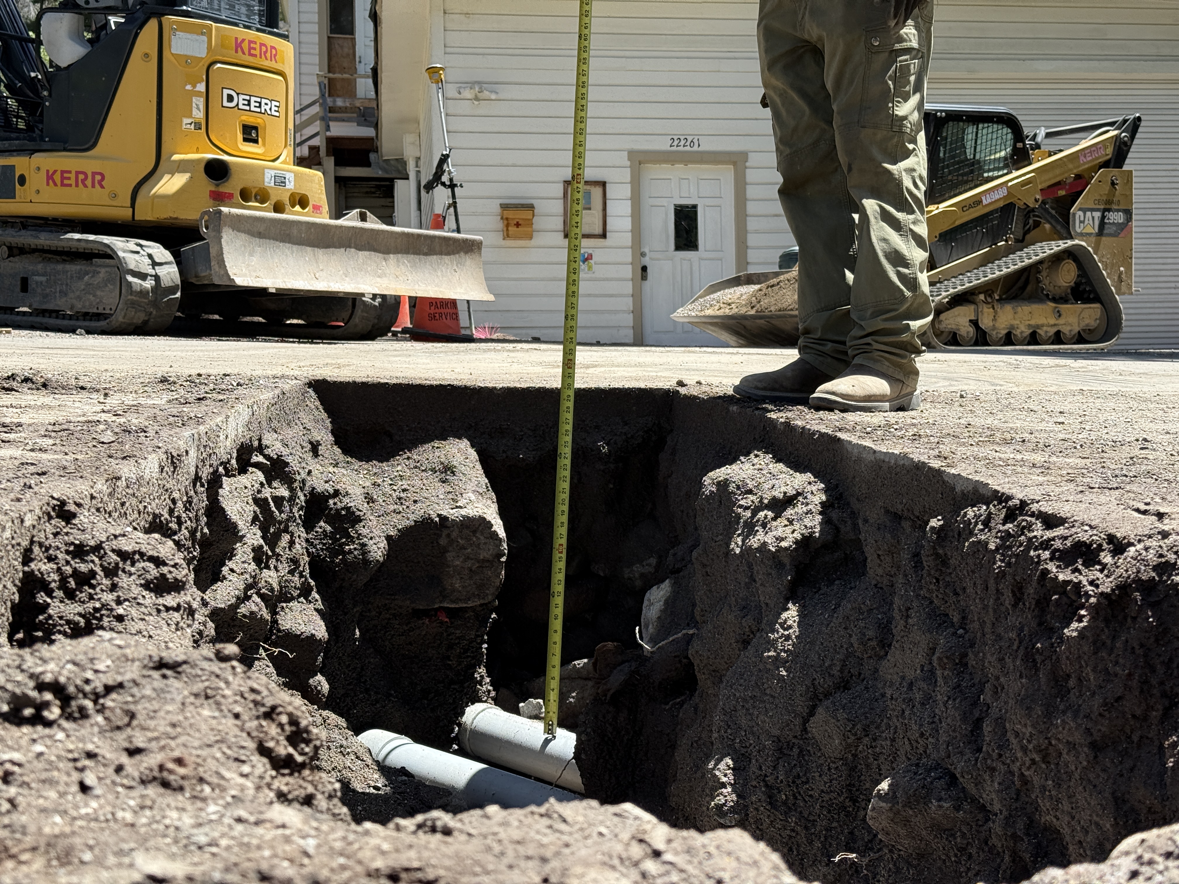 A trench with exposed piping is being measured for depth by a person standing on the trench edge. There is a John Deere excavator and a Caterpillar track loader on the site, suggesting active excavation work. The trench appears to be for utility installation or repair, with pipes visible at the bottom. The environment is dry with sunlight providing clear visibility.