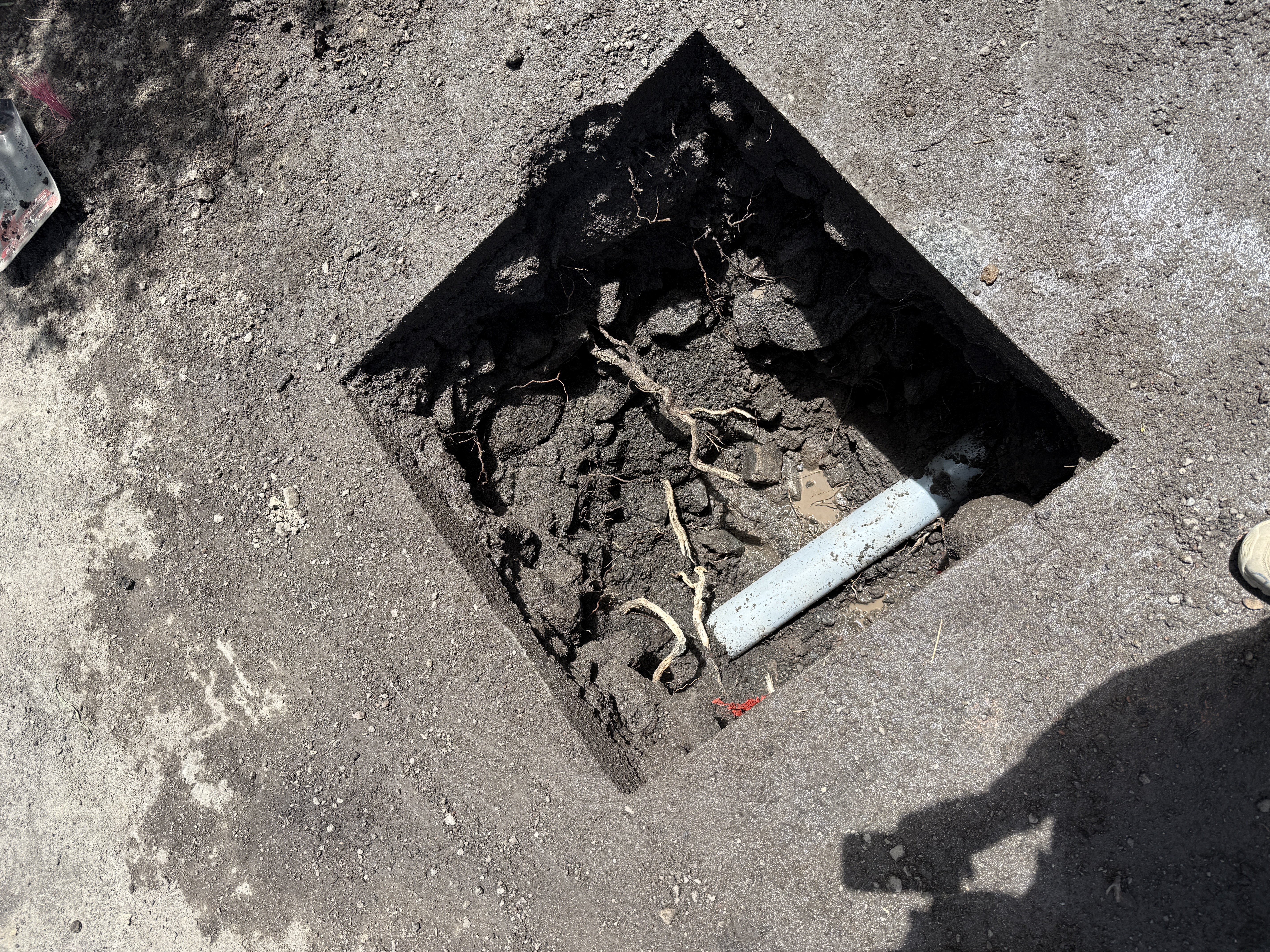 The image shows a rectangular excavation in pavement, revealing a section of pipe and surrounding soil. Roots are visible around the excavated area. The utility locating work exposes the pipe, which runs horizontally in the cut. A shadow and part of an observer's foot are visible at the bottom of the frame.