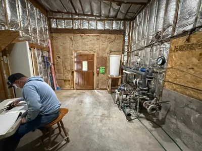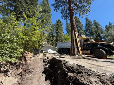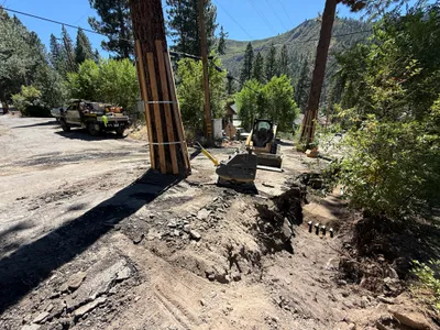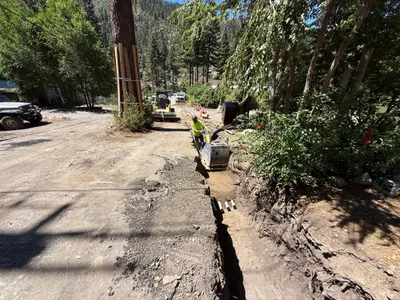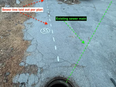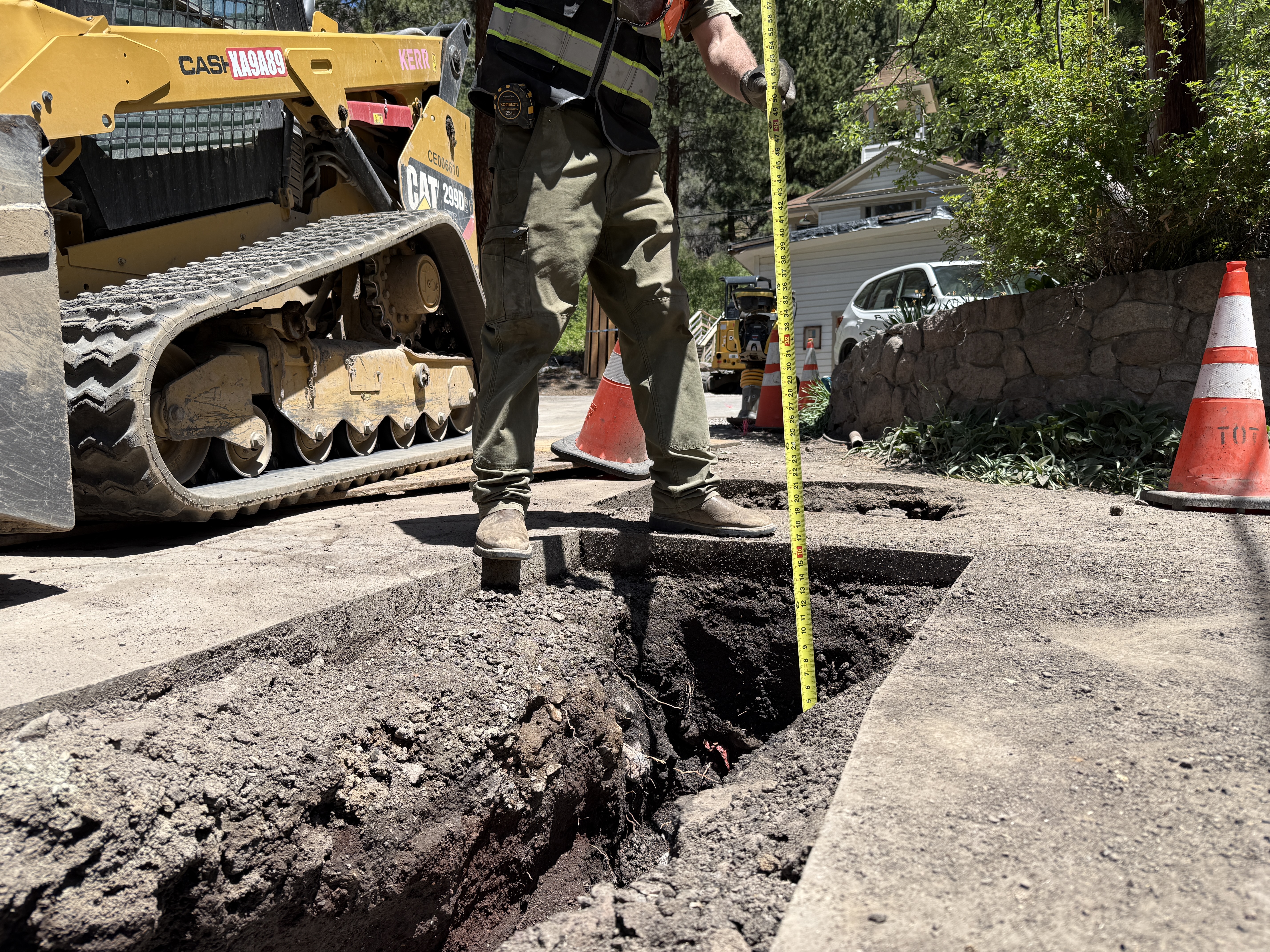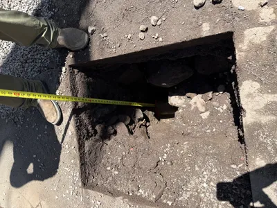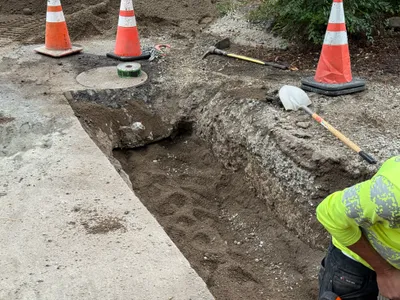 The image shows a worker standing by an open trench, using a measuring tape to measure the depth. A tracked skid steer is visible to the left, and several traffic cones are positioned around the work area. The location is a paved surface with some exposed soil where the trench is open. The presence of safety equipment is noted, including hi-vis vests and traffic cones. The image was taken during daylight hours.