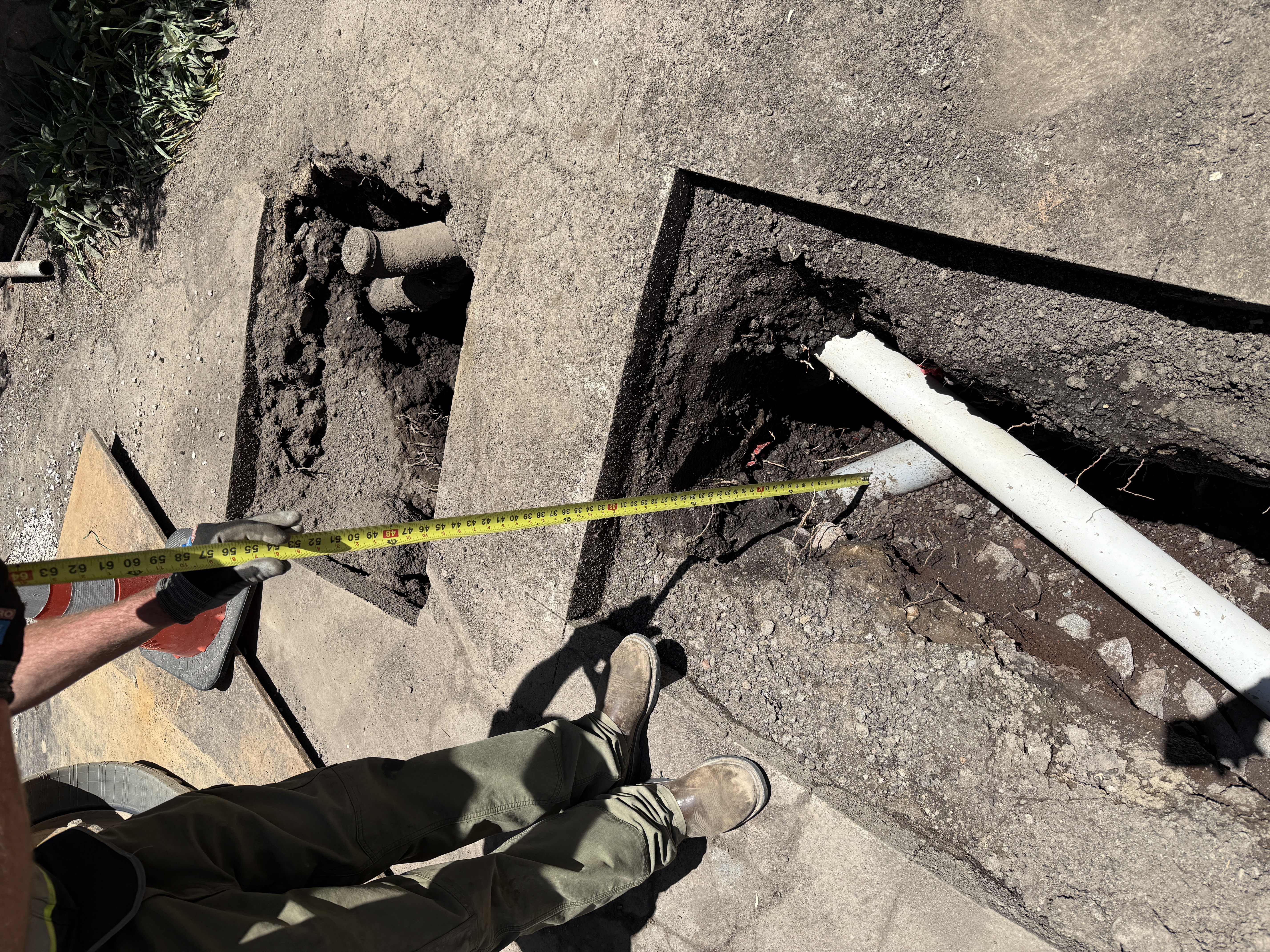 The image shows a man standing beside a trench measuring its depth using a retractable tape measure. There is a plastic pipe partially exposed in the trench. The trench is surrounded by a concrete surface with two rectangular cutouts. Another trench is visible nearby with soil piled around it. A traffic cone is partly visible at the edge of the frame.