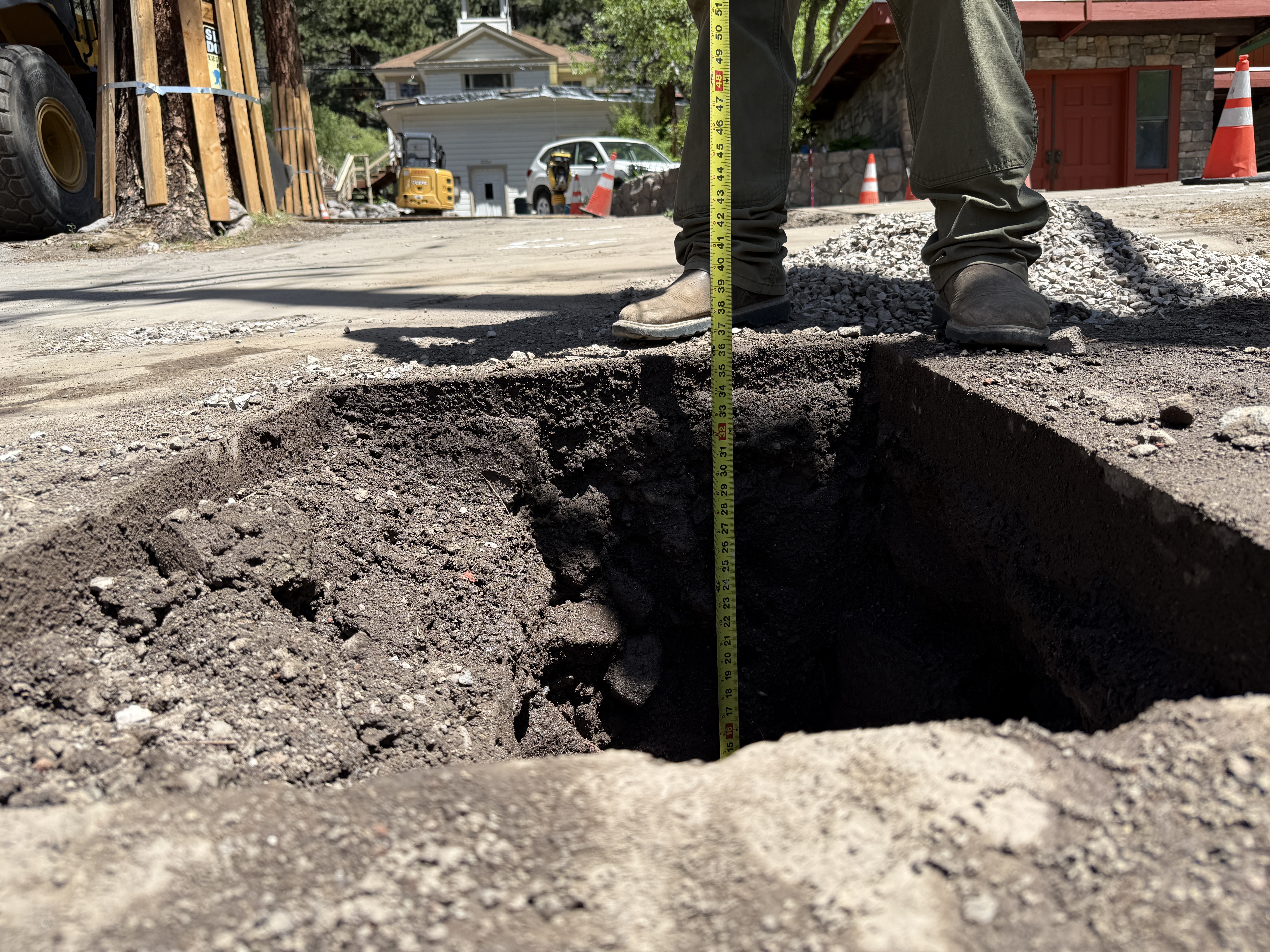 The image shows a construction site where a pothole has been excavated for utility locating. A person is measuring the depth of the trench with a measuring tape. The trench is located on a roadway and surrounded by loose soil and gravel. Traffic cones and a building are visible in the background, indicating the surroundings and position of the site work.
