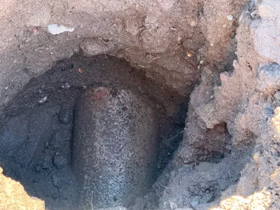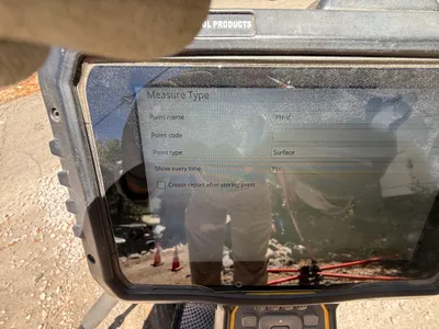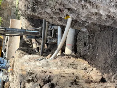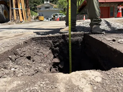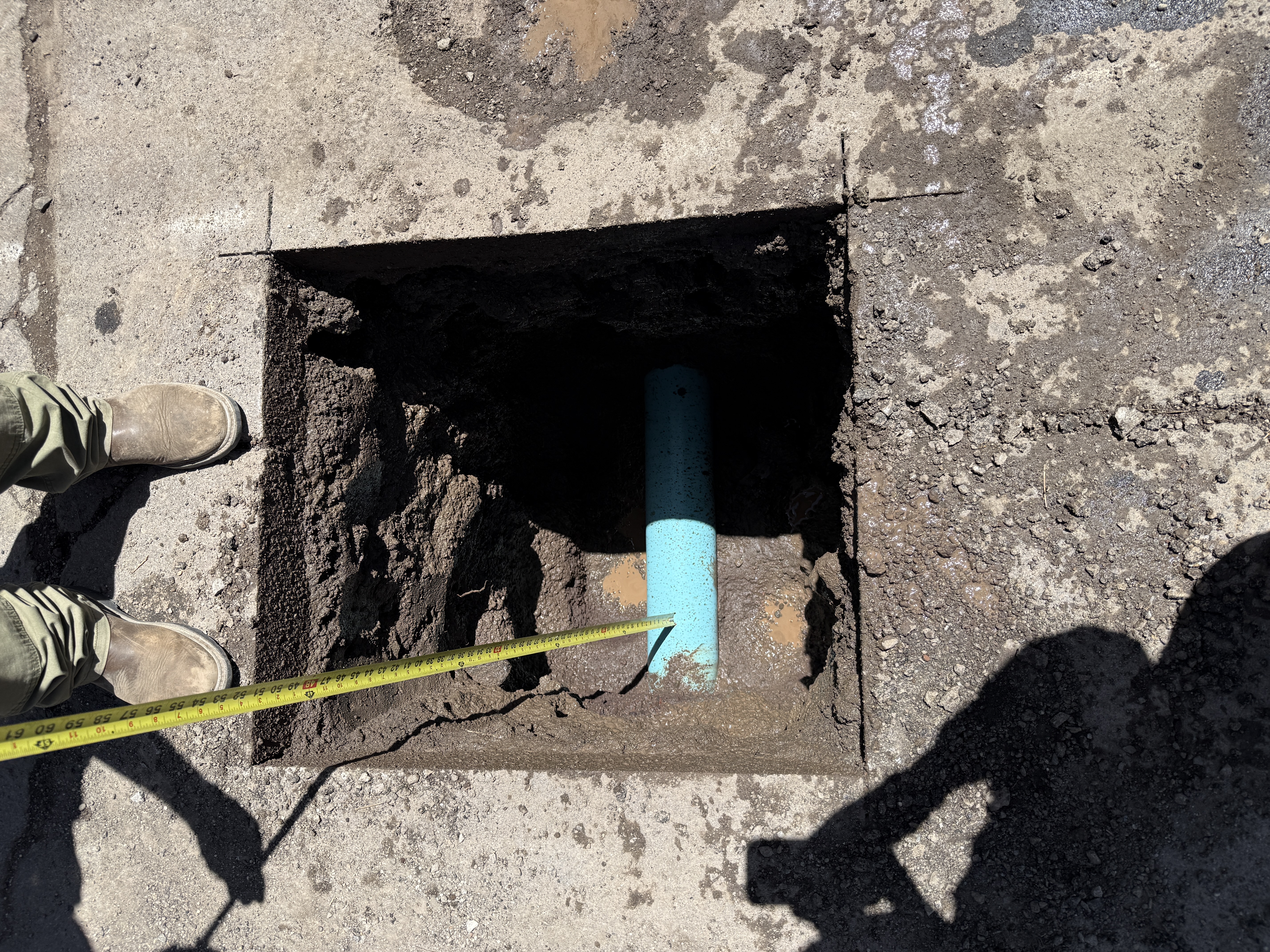 The image shows a square pothole cut into a concrete pavement with an exposed blue pipe running through it. A person holding a measuring tape is standing beside the pothole, which is being measured. The surrounding area shows broken concrete and soil, indicating a utility locating operation underway.