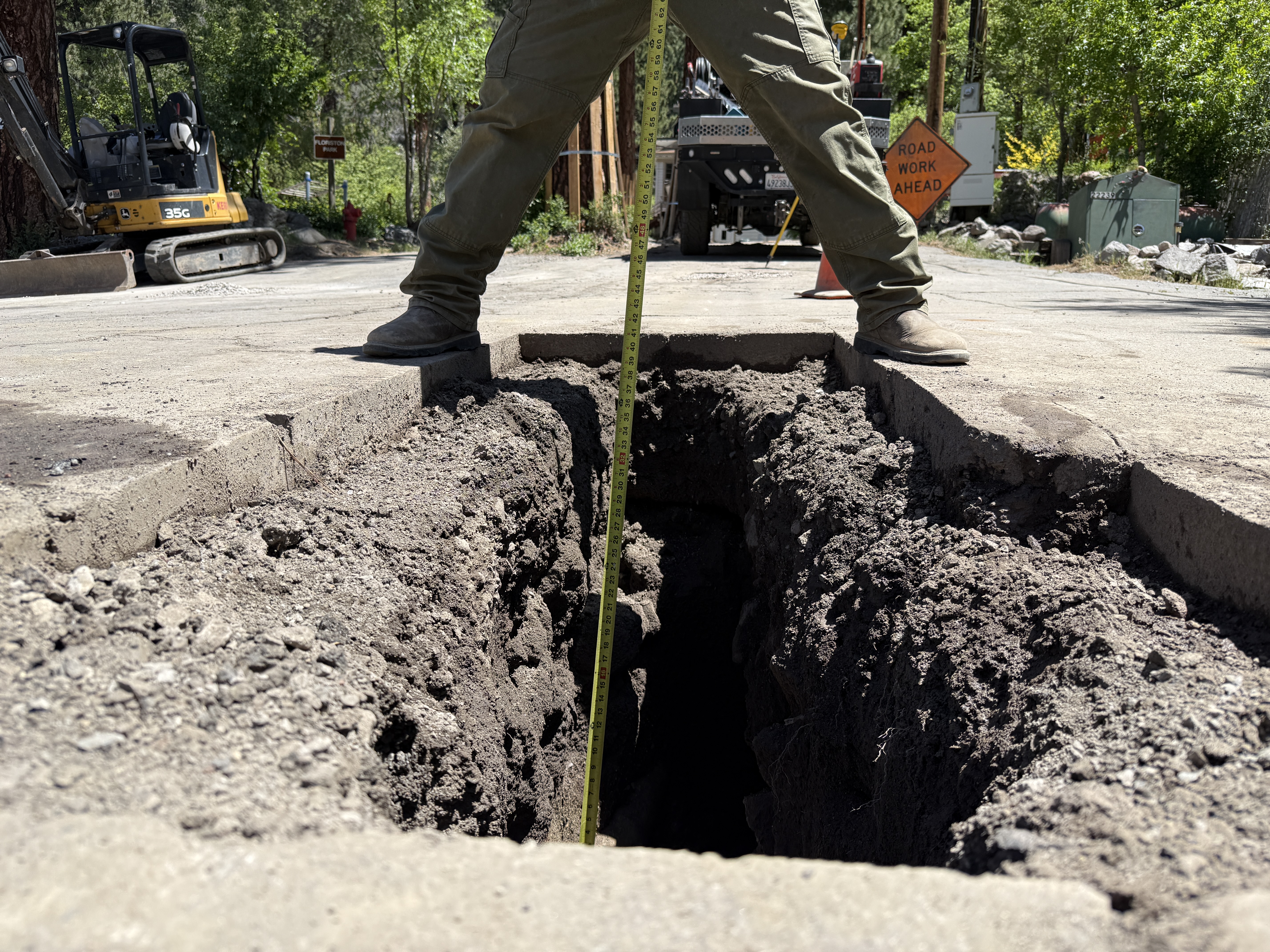 The image shows a trench running along a paved road with a person measuring its depth using a measuring tape. An excavator is present on the left side along the roadside. There is a 'road work ahead' sign and a construction vehicle in the background. It appears to be a utility trench in the process of excavation.