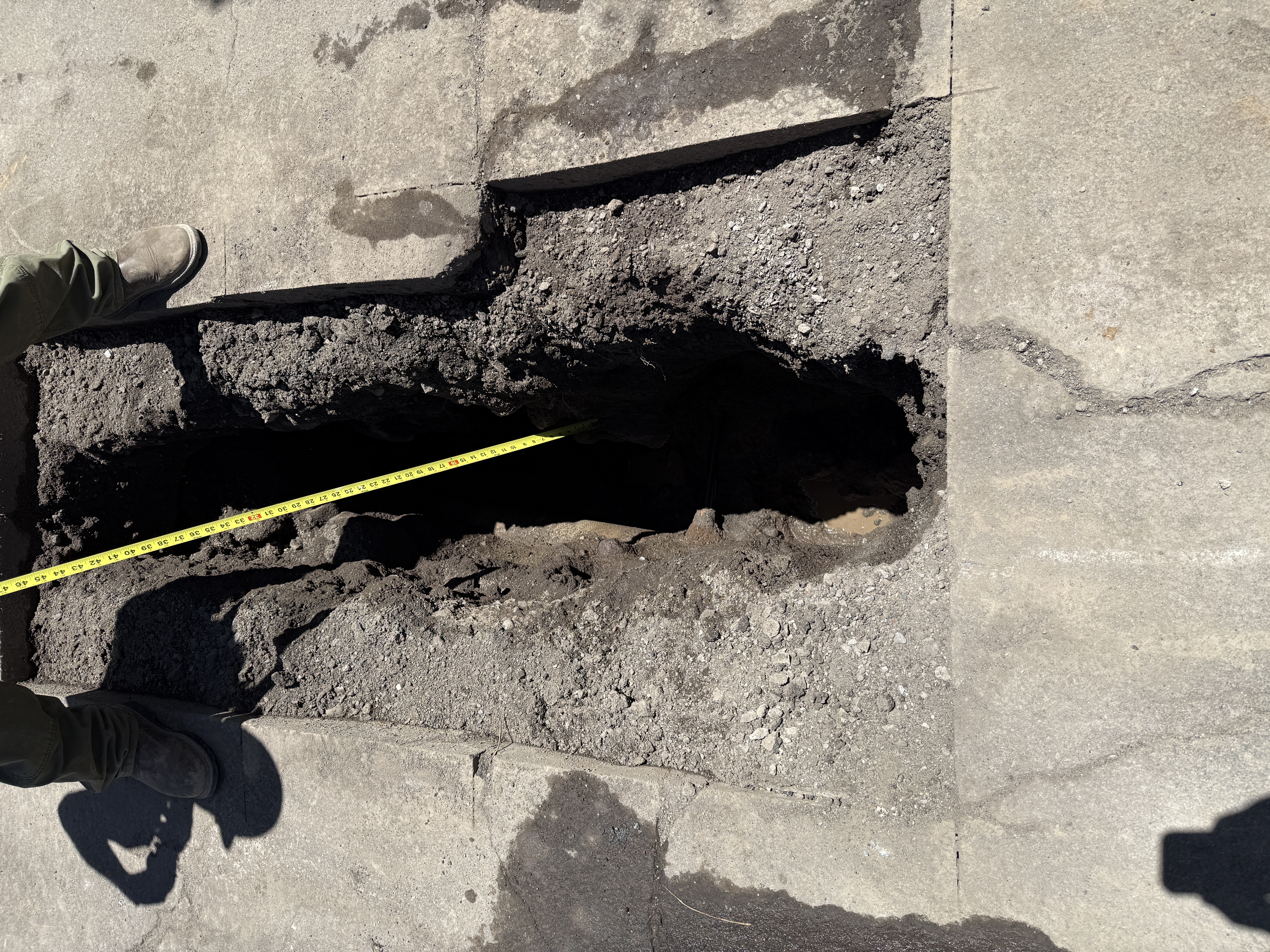 The image shows a trench cut into an asphalt surface with loose soil around its edges. A person is measuring the depth using a measuring tape. The trench appears straight and has been cut from an asphalt pavement. There is notable sunlight providing clear visibility.