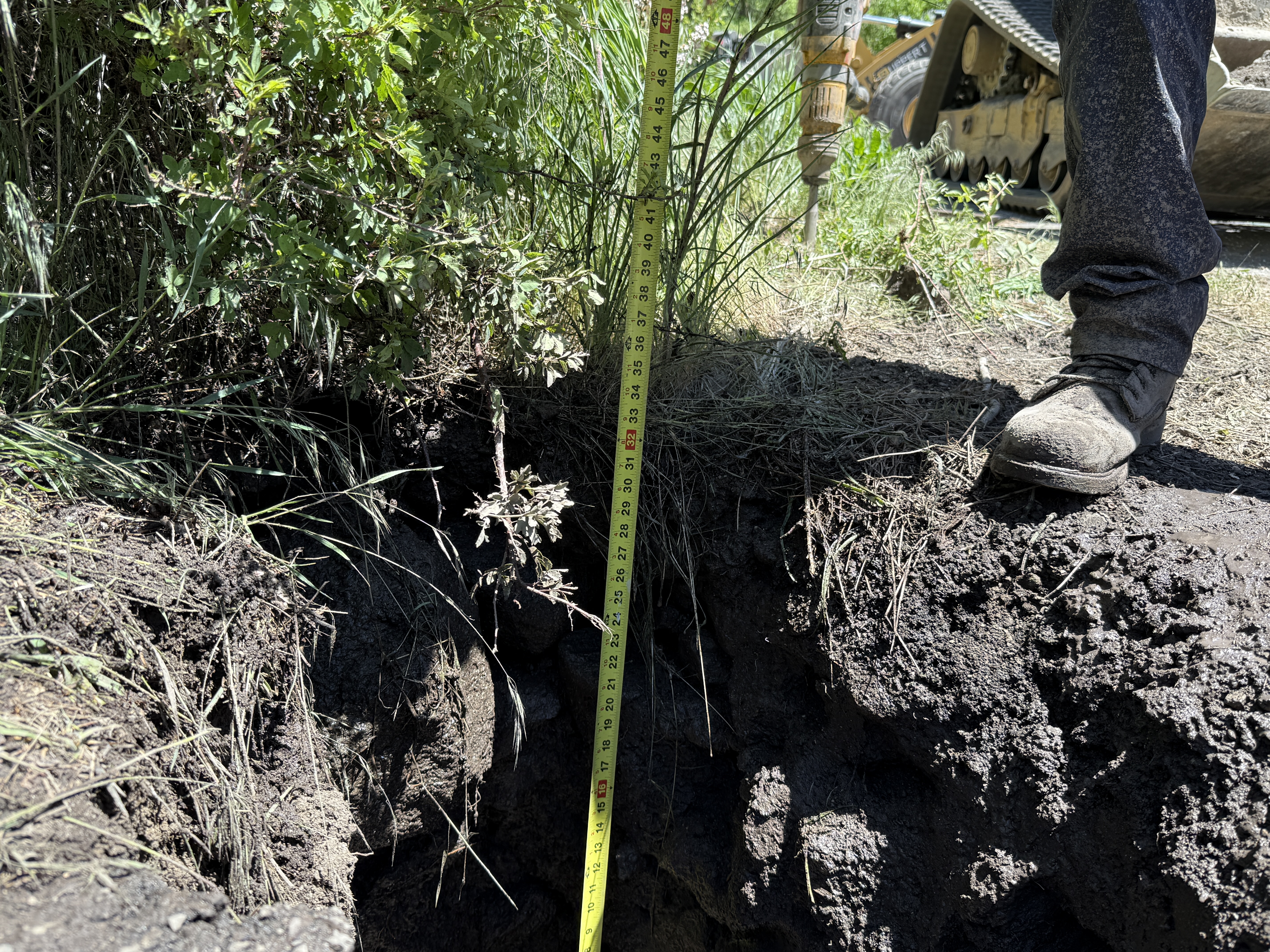 The image depicts a trench being measured using a tape measure, with an individual standing on the edge. The soil appears to be recently disturbed, and a piece of heavy machinery is partially visible in the background. Vegetation surrounds the trench, indicating the location is outdoors. This is likely part of a utility locating activity.