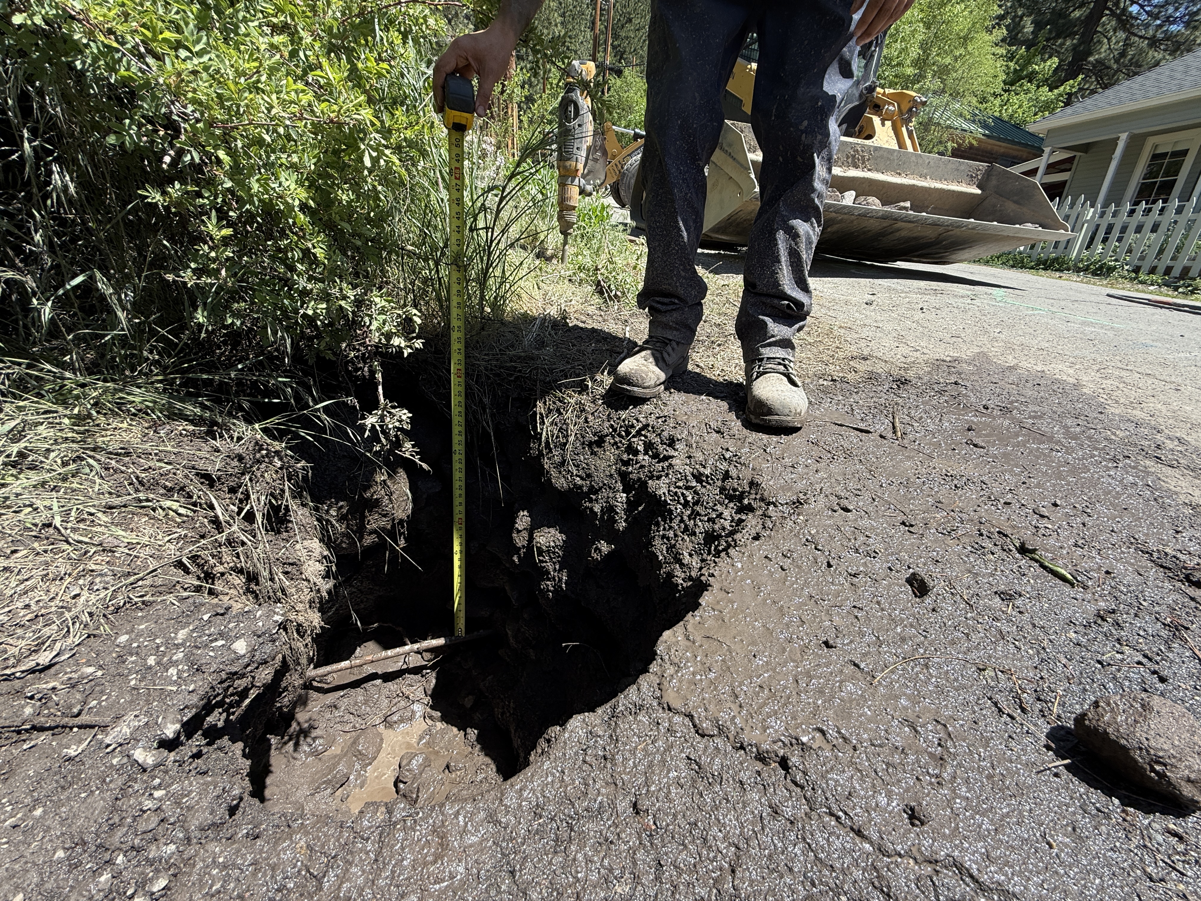 A person is using a tape measure to determine the depth of a pothole. The pothole is located on a muddy surface next to some vegetation. In the background, a construction vehicle is visible, likely indicating an active worksite. The presence of water or mud suggests recent or ongoing excavation work.