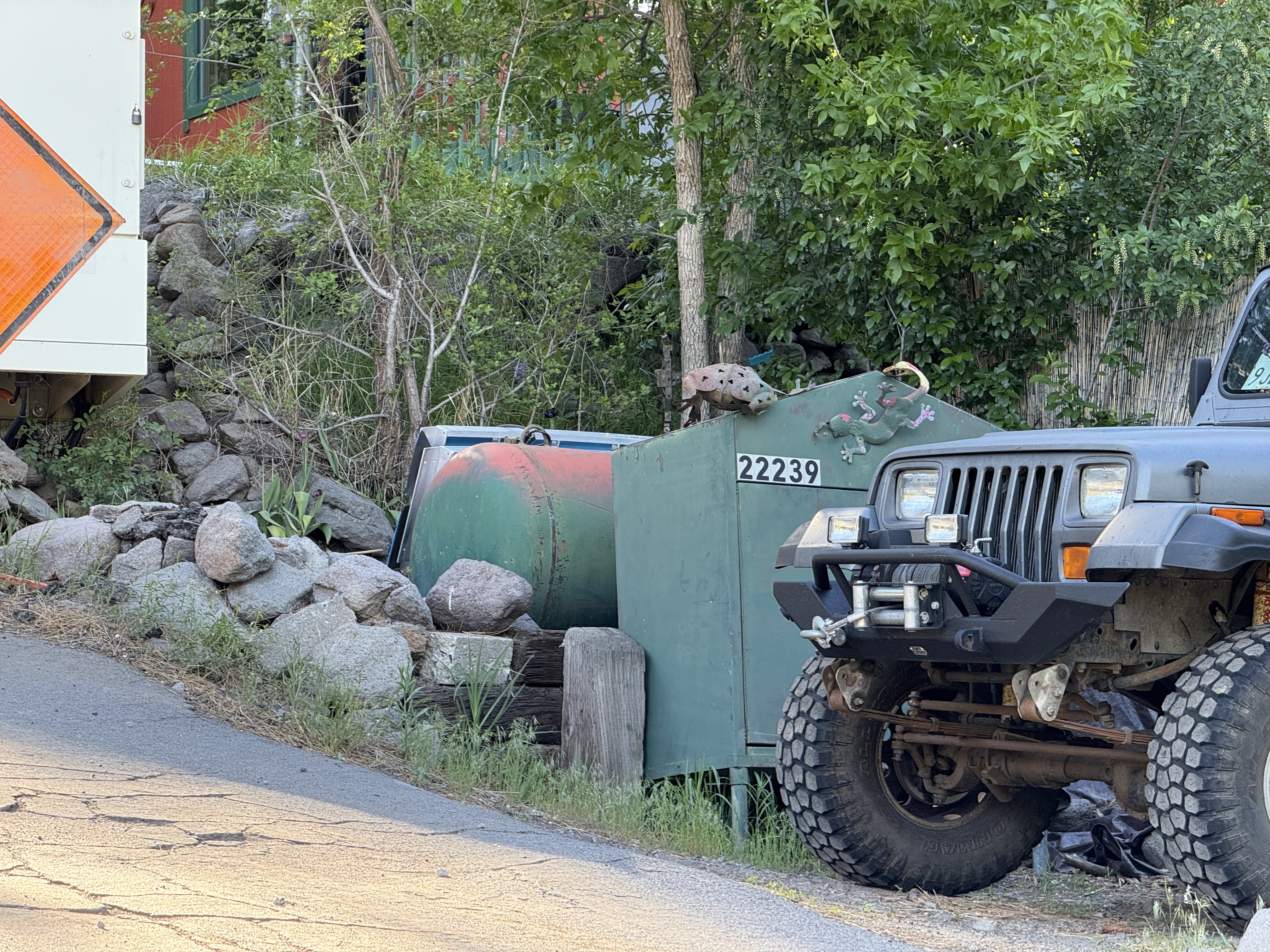 The image shows a jeep with off-road tires parked partially off a paved road. Next to it is a large metal container labeled with the number '22239'. The area around the container is surrounded by stones, and a reflective traffic sign is visible to the left. No active construction work is evident in the image.