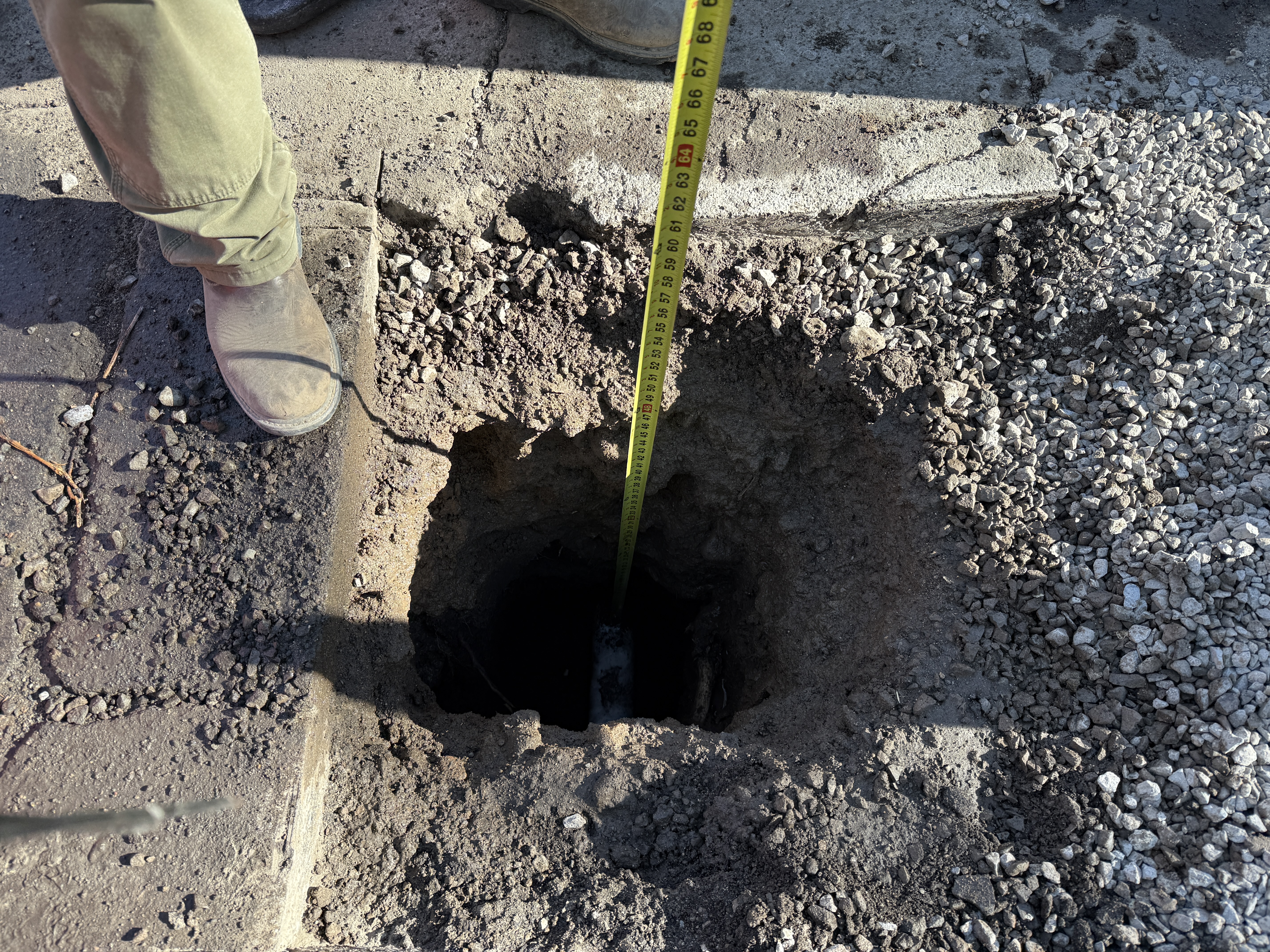 The image depicts an excavation site where a pothole has been dug into a paved surface for utility locating. A person is using a measuring tape to measure the depth of the hole. Loose gravel is visible around the site, and the ground shows rough, uneven conditions.