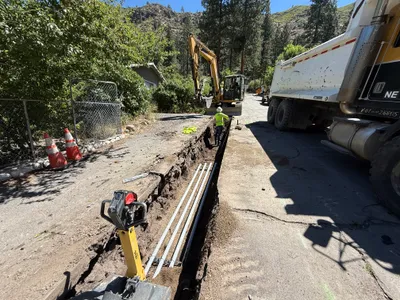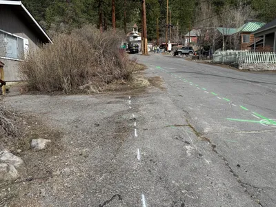 The image shows a deep hole being examined, likely for pothole utility locating on Juniper Street. A person is standing near the edge of the excavation, using a measuring tape to assess the depth. The soil is dark and clumpy, suggesting recent excavation activity. There are no visible utilities or markings in the hole.