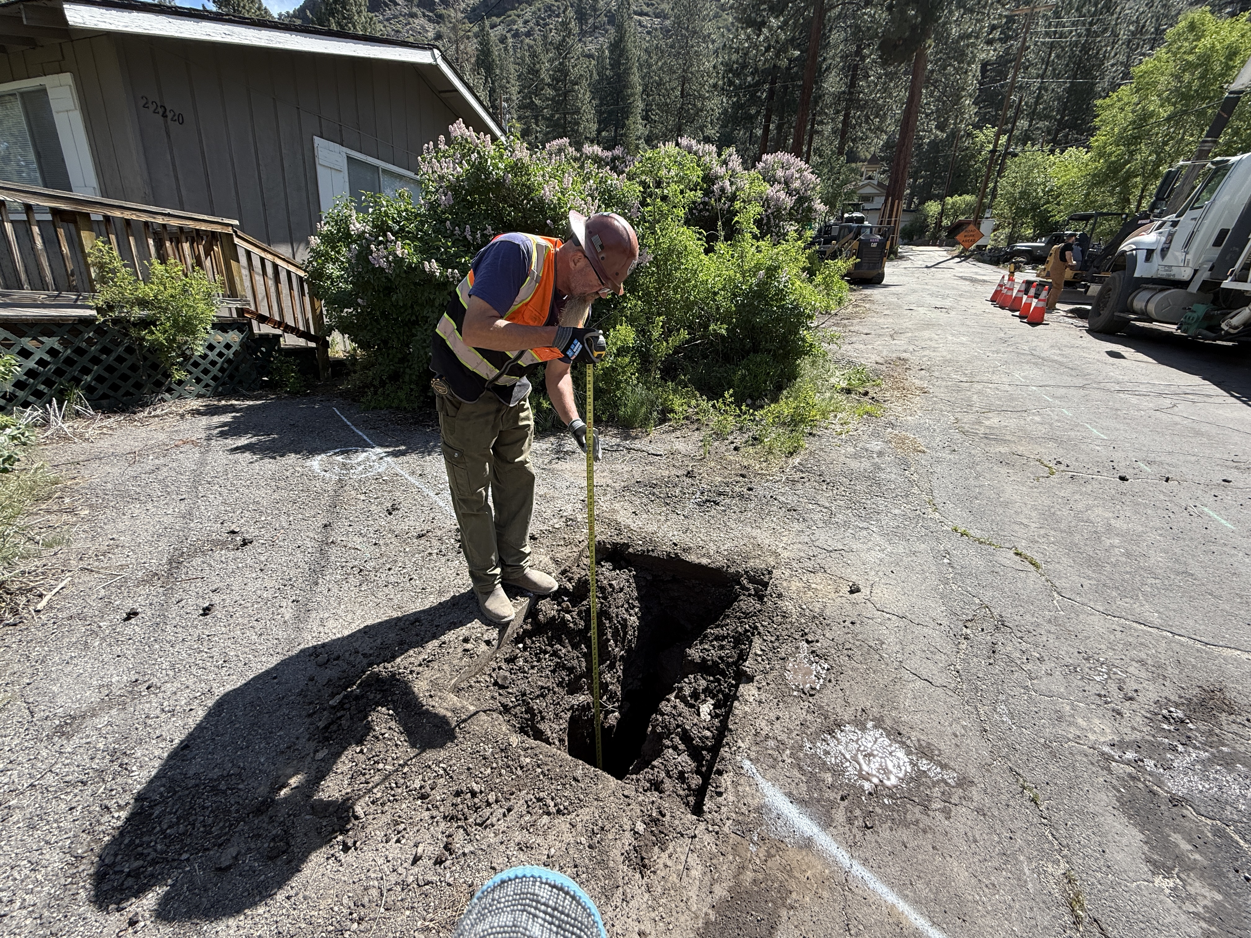 The image shows a construction worker using a measuring tape to determine the depth of a pothole. The pothole is located on a paved area near a residential structure. Several vehicles are visible in the background, along with traffic cones for safety. The worker wears a hard hat, hi-vis vest, and work boots, indicating safety precautions.