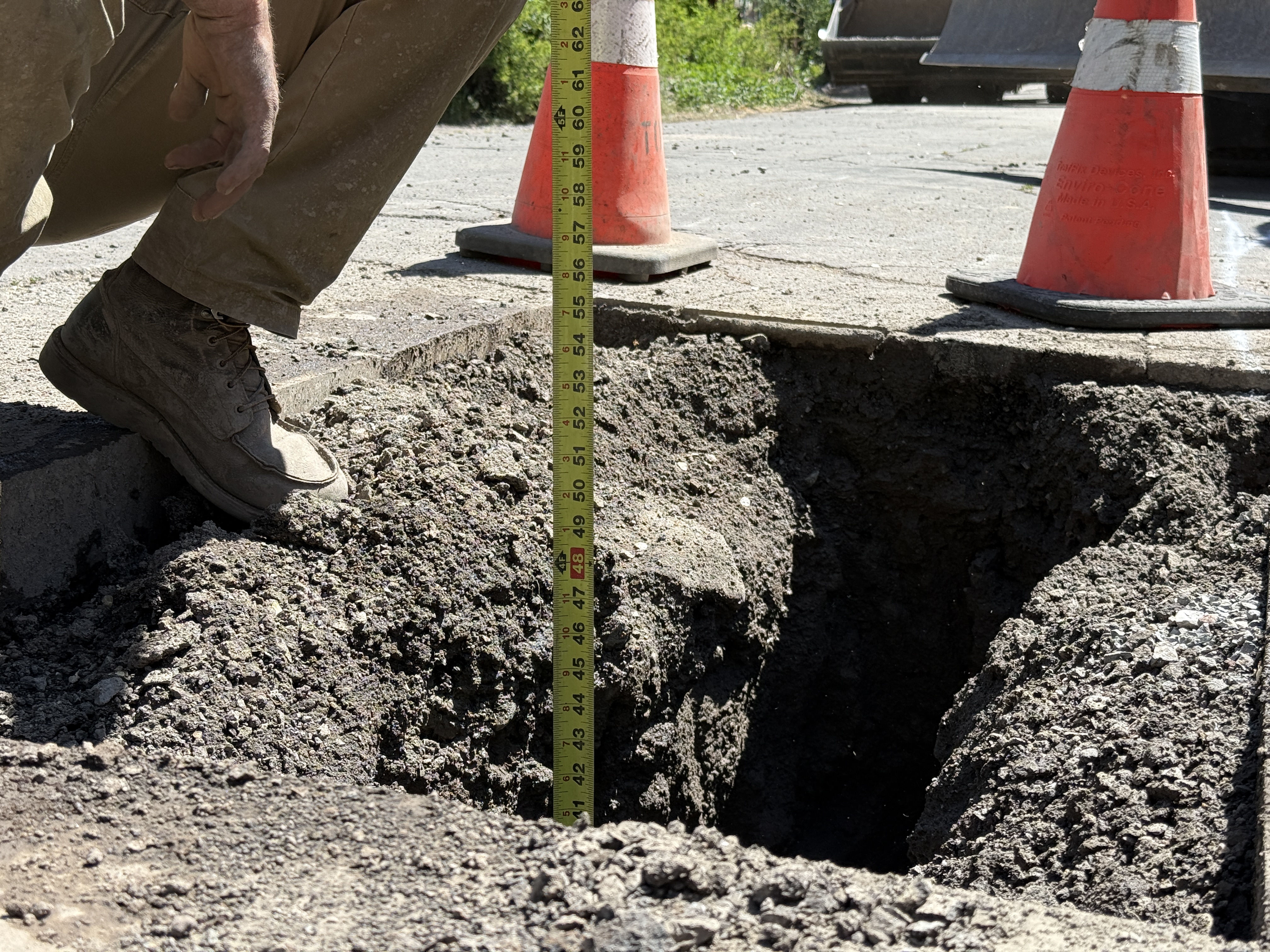 A worker is crouching beside a pothole on a pavement, using a tape measure to determine its depth. Traffic cones are placed nearby, indicating a controlled site setup. The soil appears loose and freshly excavated, with no specific utility components visible in the hole. The image suggests the activity is related to utility locating, possibly for future construction or repairs.