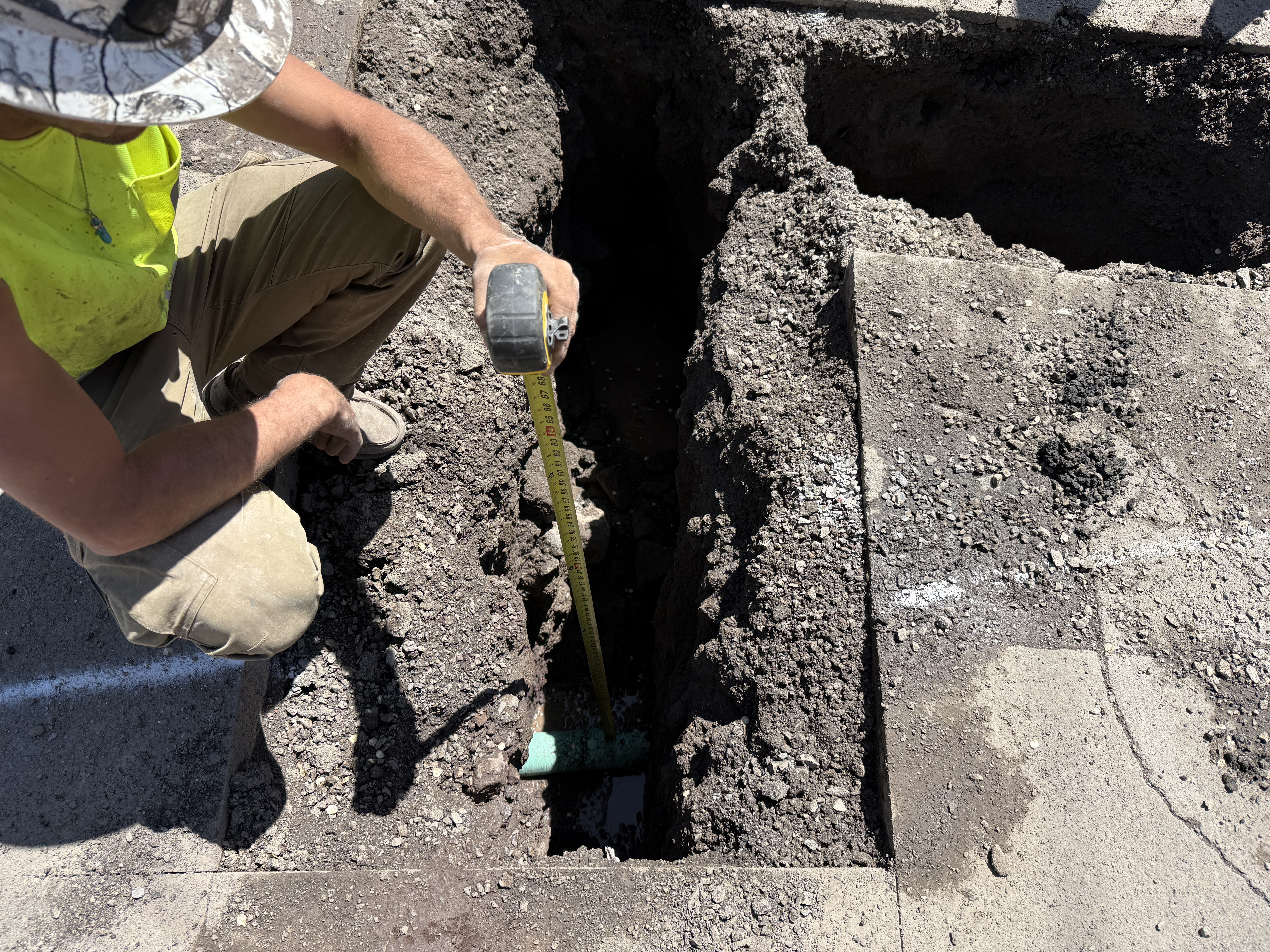 The image shows a worker in a hard hat and hi-vis vest kneeling beside a trench, using a tape measure to check the depth of the trench. The trench is filled with dark soil, and a green pipe is visible at the bottom. The ground surface surrounding the trench appears to be paved, possibly asphalt or concrete, with some white chalk markings visible on the pavement.
