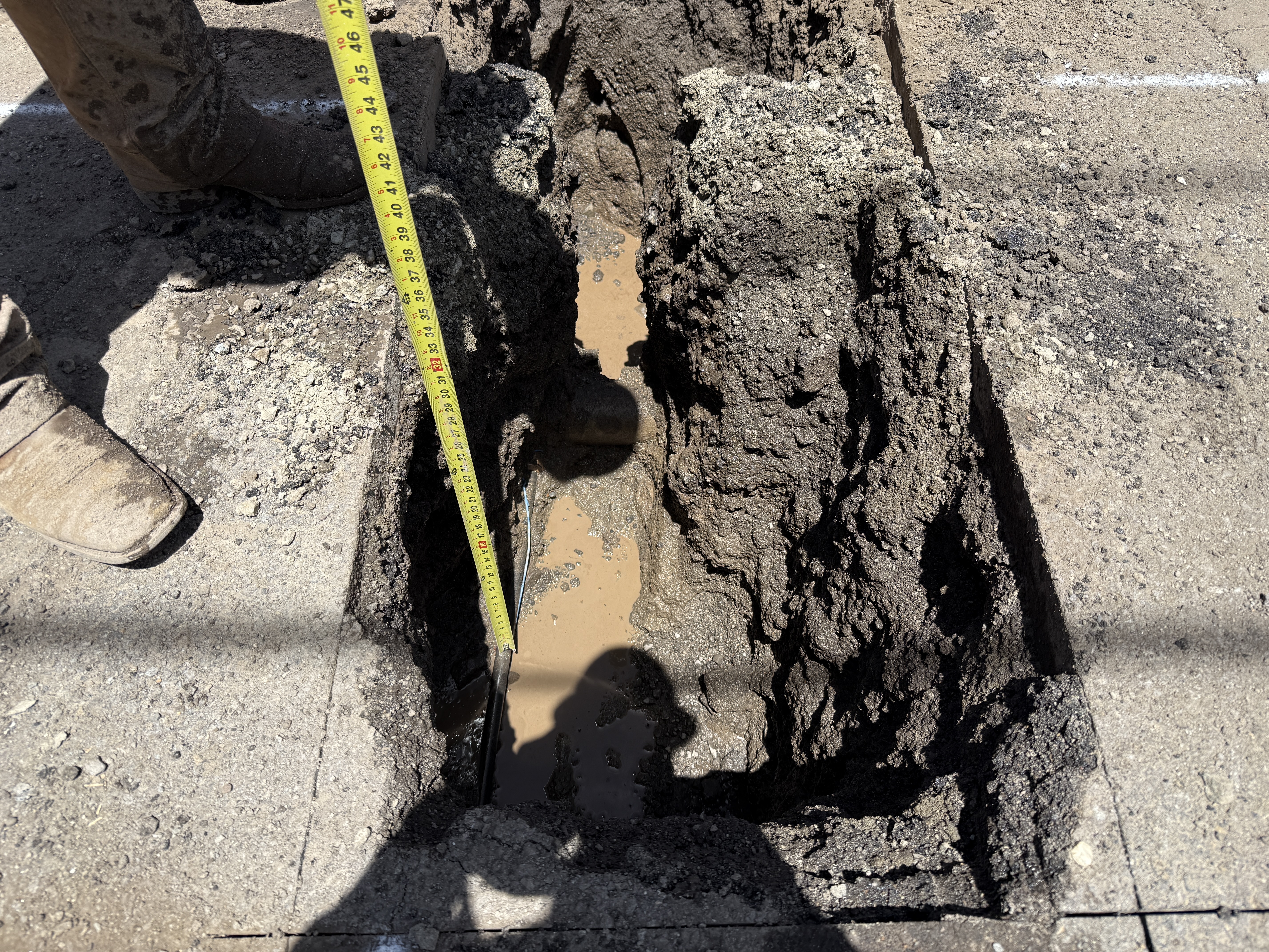 The image shows an open trench with a measuring tape extending into it, suggesting ongoing pothole utility locating work. A person is standing near the edge of the trench, and there is a visible accumulation of mud or water in the trench. The surrounding area is comprised mainly of soil and pavement, indicating recent excavation activity. The presence of a person's shadow suggests direct sunlight.