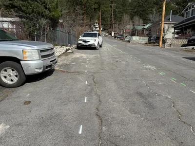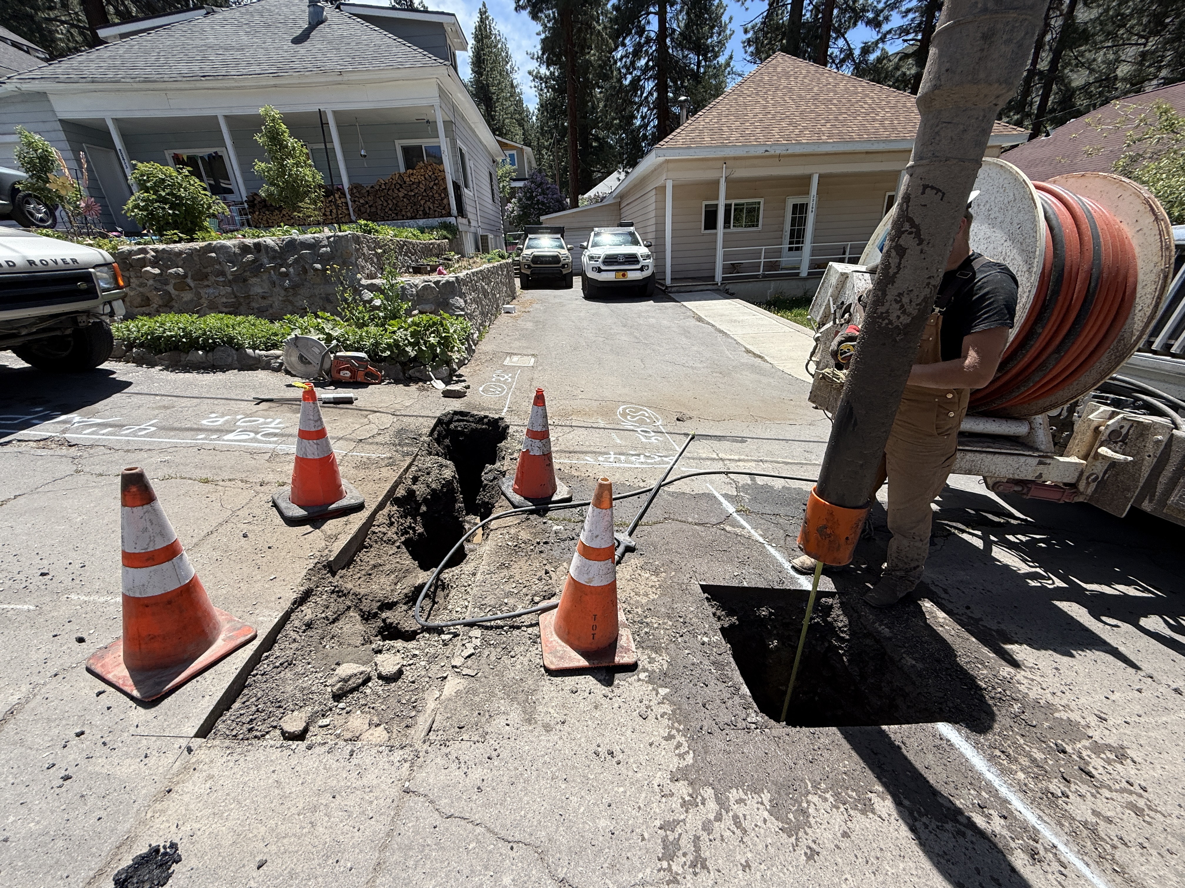 paved street with open pothole clear daytime lighting limited access due to cones and parked vehicles