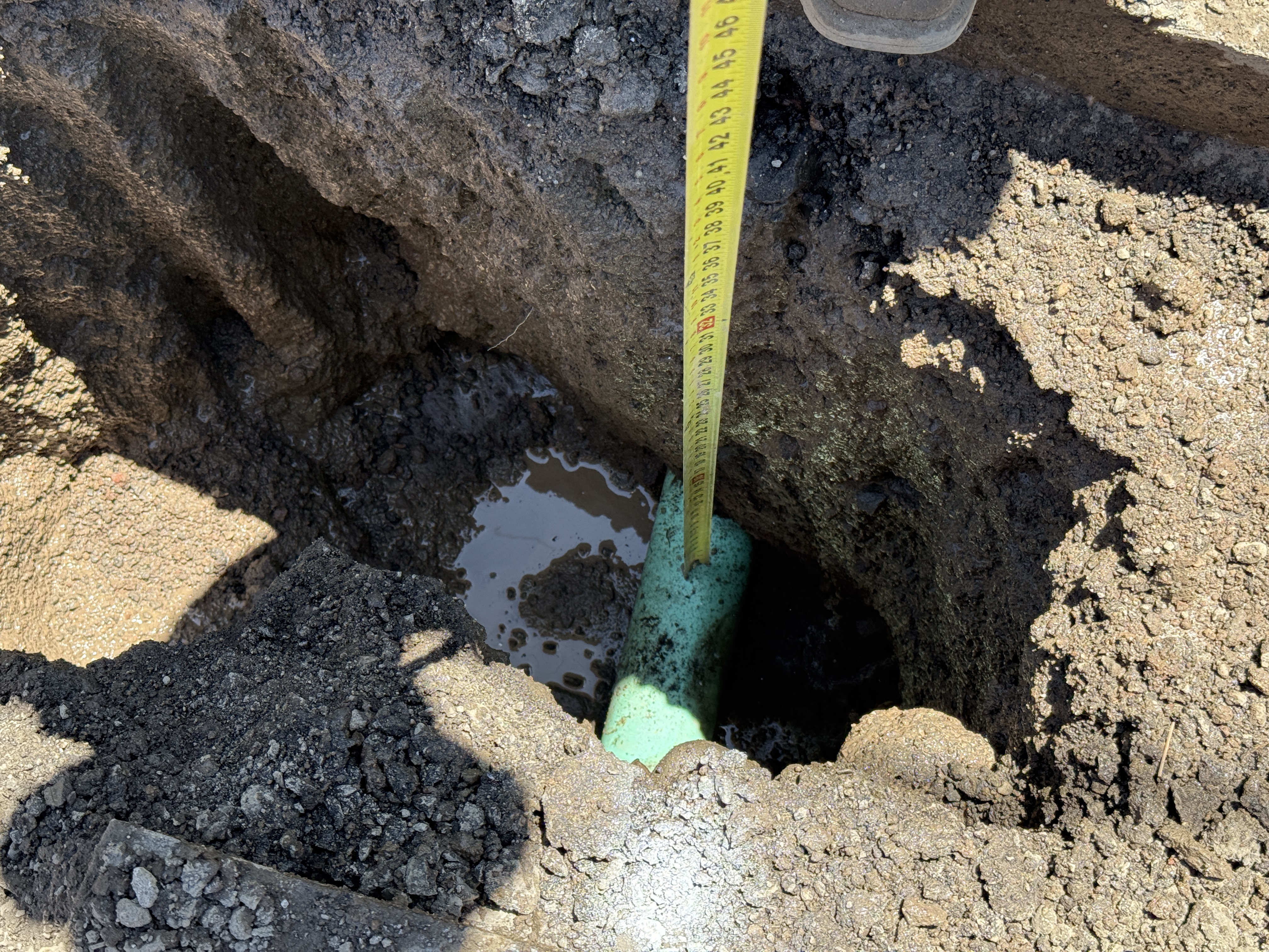The image shows an excavated hole with a green pipe at the bottom. There is a measuring tape vertically placed in the hole to gauge its depth. The surrounding soil is loose, and a small amount of water is visible at the base of the hole. There is a shadow of a person indicating some human presence.